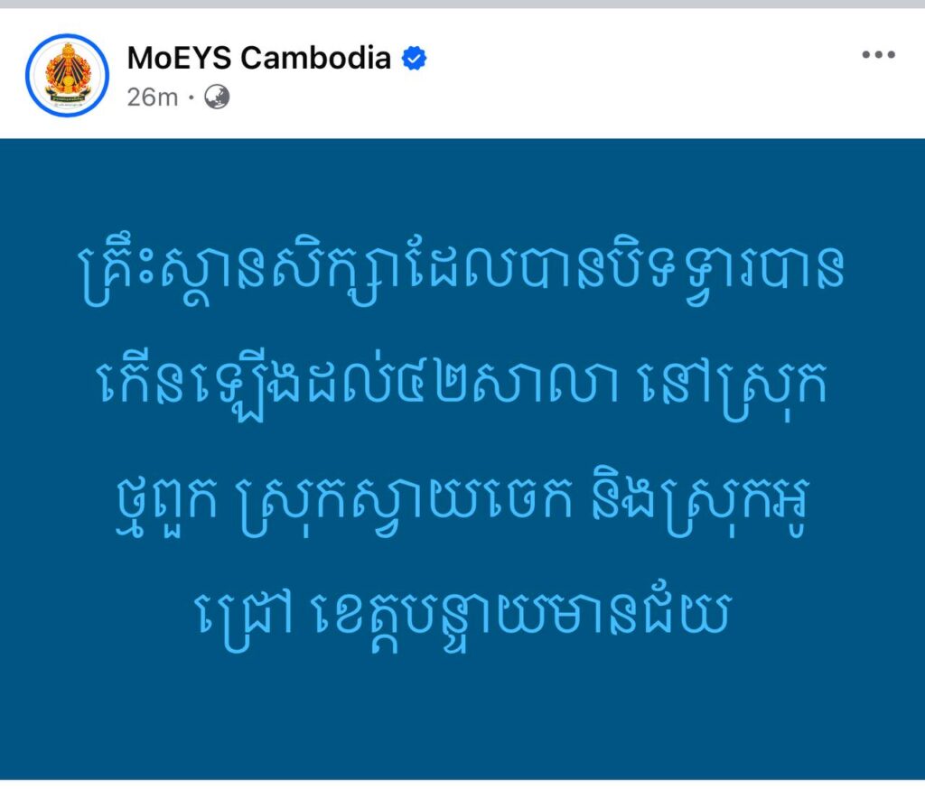 ភ្នំពេញ ៖ តាមរយៈបណ្ដញសង្គម នាព្រឹកថ្ងៃទី៨ ខែធ្នូ ឆ្នាំ២០២៥នេះ ក្រសួងអប់រំ យុវជន និងកីឡា បានឲ្យដឹងថា គ្រឹះស្ថានសិក្សា ដែលបានបិទទ្វារបានកើនឡើងដល់ ៤២សាលា នៅស្រុកថ្មពួក ស្រុកស្វាយចេក និងស្រុកអូជ្រៅ ខេត្តបន្ទាយមានជ័យ ។