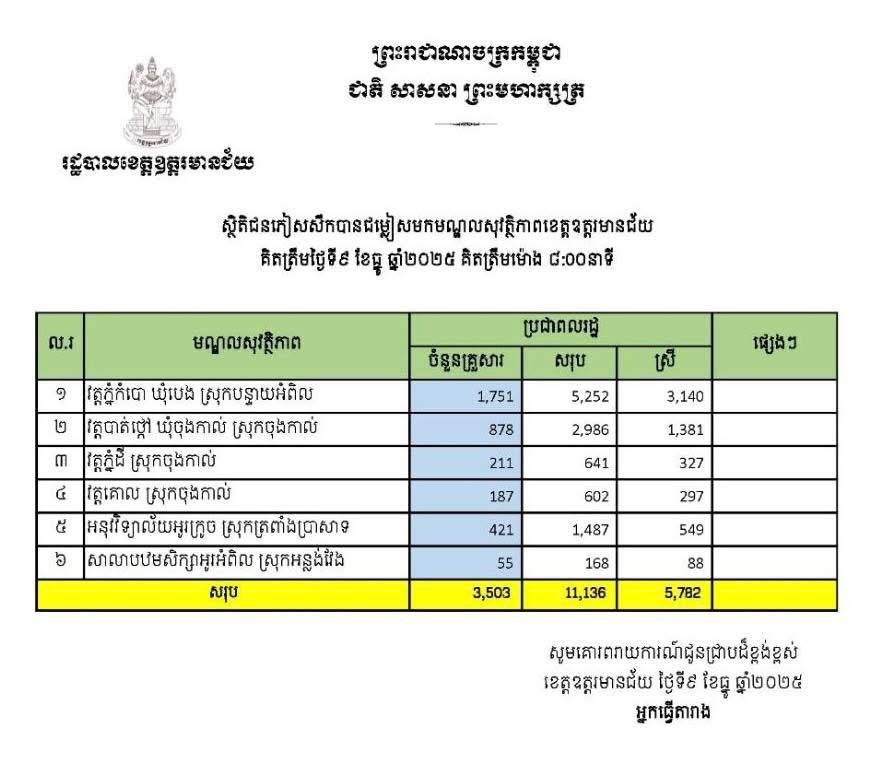 ភ្នំពេញ ៖ អ្នកនាំពាក្យរដ្ឋបាល ខេត្តឧត្តរមានជ័យ បានឲ្យដឹងថា ជនភៀសសឹកបានជម្លៀស មកមណ្ឌលសុវត្ថិភាពទាំង៦ នៃ៤ស្រុក ក្នុងខេត្តឧត្តរមានជ័យ គិតត្រឹមម៉ោង៨ព្រឹក នាថ្ងៃទី៩ ខែធ្នូ មានចំនួនសរុប៣ ៥០៣គ្រួសារ ស្មើ ១១ ១៣៦នាក់ ក្នុងនោះស្រី ៥ ៧៨២នាក់ ៕