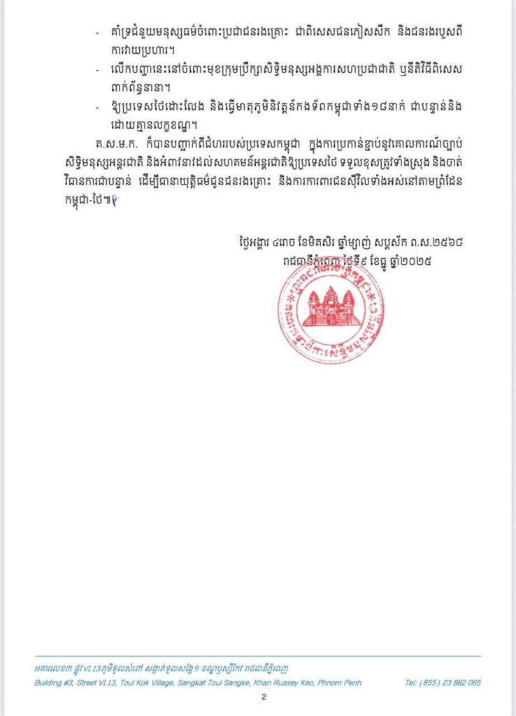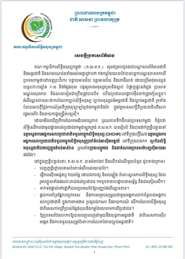 ភ្នំពេញ ៖ គណៈកម្មាធិការសិទ្ធិមនុស្សកម្ពុជា ដាក់ញត្តិបន្ទាន់ទៅ ឧត្តមស្នងការអង្គការ សហប្រជាជាតិ ទទួលបន្ទុកសិទ្ធិមនុស្ស (OHCHR) នៅទីក្រុងហ្សឺណែវ, ឧត្តមស្នងការ អង្គការសហប្រជាជាតិ ទទួលបន្ទុកសិទ្ធិមនុស្ស ប្រចាំតំបន់អាស៊ីអាគ្នេយ៍ នៅទីក្រុងបាងកក និងស្ថាប័នសិទ្ធិមនុស្សជាតិឯករាជ្យ ក្នុងតំបន់អាស៊ាន ព្រមទាំងប្រធានប្តូរវេន និងជាតំណាងប្រទេសម៉ាឡេស៊ីអាយឆា ពាក់ព័ន្ធនឹងករណីការប្រើប្រាស់ កម្លាំងយោធារបស់ថៃ បន្តឈ្លានពានមកលើដែន អធិបតេយ្យភាពរបស់កម្ពុជា។