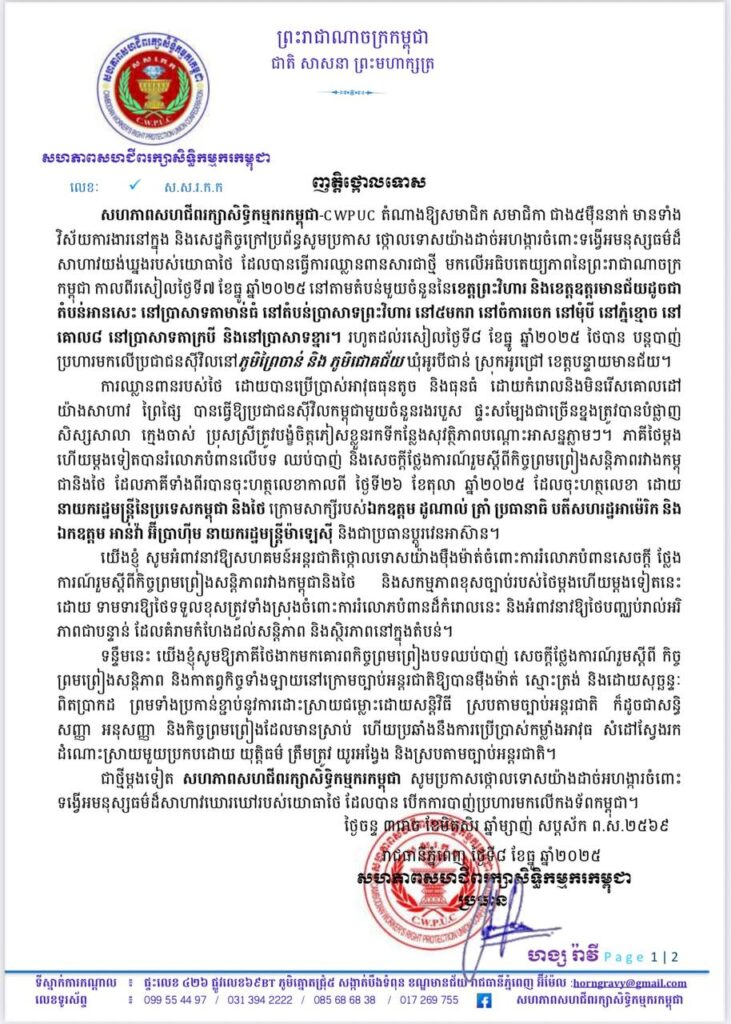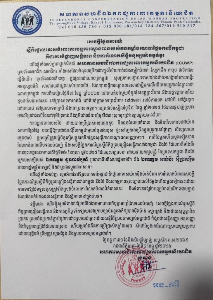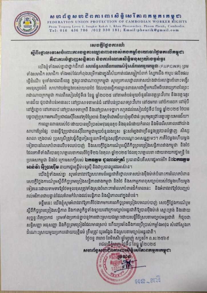 ញត្តិថ្កោលទោសរបស់ក្រុមសហជីព បានលើកឡើងបន្តថា ភាគីថៃម្តងហើយម្តងទៀត បានរំលោភបំពានលើបទឈប់បាញ់ និងសេចក្តីថ្លែងការណ៍រួម ស្តីពី កិច្ចព្រមព្រៀងសន្តិភាព រវាងកម្ពុជានិងថៃ ដែលភាគីទាំងពីរបានចុះហត្ថលេខា កាលពីថ្ងៃទី២៦ ខែតុលា ឆ្នាំ២០២៥ ដែលចុះហត្ថលេខា ដោយនាយករដ្ឋមន្ត្រីនៃប្រទេសកម្ពុជា និងថៃ ក្រោមសាក្សីរបស់ឯកឧត្តម ដូណាល់ ត្រាំ ប្រធានាធិបតីសហរដ្ឋអាម៉េរិក និង ឯកឧត្តម អាន់វ៉ា អ៊ីប្រាហ៊ីម នាយករដ្ឋមន្ត្រីម៉ាឡេស៊ី និងជាប្រធានប្តូរវេនអាស៊ាន។