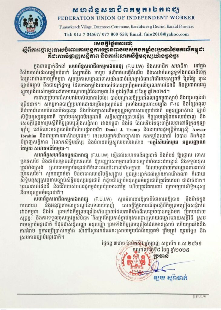 ជាមួយគ្នានេះ ក្រុមសហជីព បានអំពាវនាវឱ្យសហគមន៍អន្តរជាតិថ្កោលទោសយ៉ាងម៉ឺងម៉ាត់ ចំពោះការរំលោភបំពានសេចក្តីថ្លែងការណ៍រួម ស្តីពី កិច្ចព្រមព្រៀងសន្តិភាព រវាងកម្ពុជា និងថៃ និងសកម្មភាពខុសច្បាប់របស់ថៃ ម្តងហើយម្តងទៀតនេះ ដោយទាមទារឱ្យថៃ ទទួលខុសត្រូវទាំងស្រុង ចំពោះការរំលោភបំពានដ៏កំរោលនេះ និងអំពាវនាវឱ្យថៃបញ្ឈប់រាល់អរិភាពជាបន្ទាន់ ដែលគំរាមកំហែងដល់សន្តិភាព និងស្ថិរភាពនៅក្នុងតំបន់។