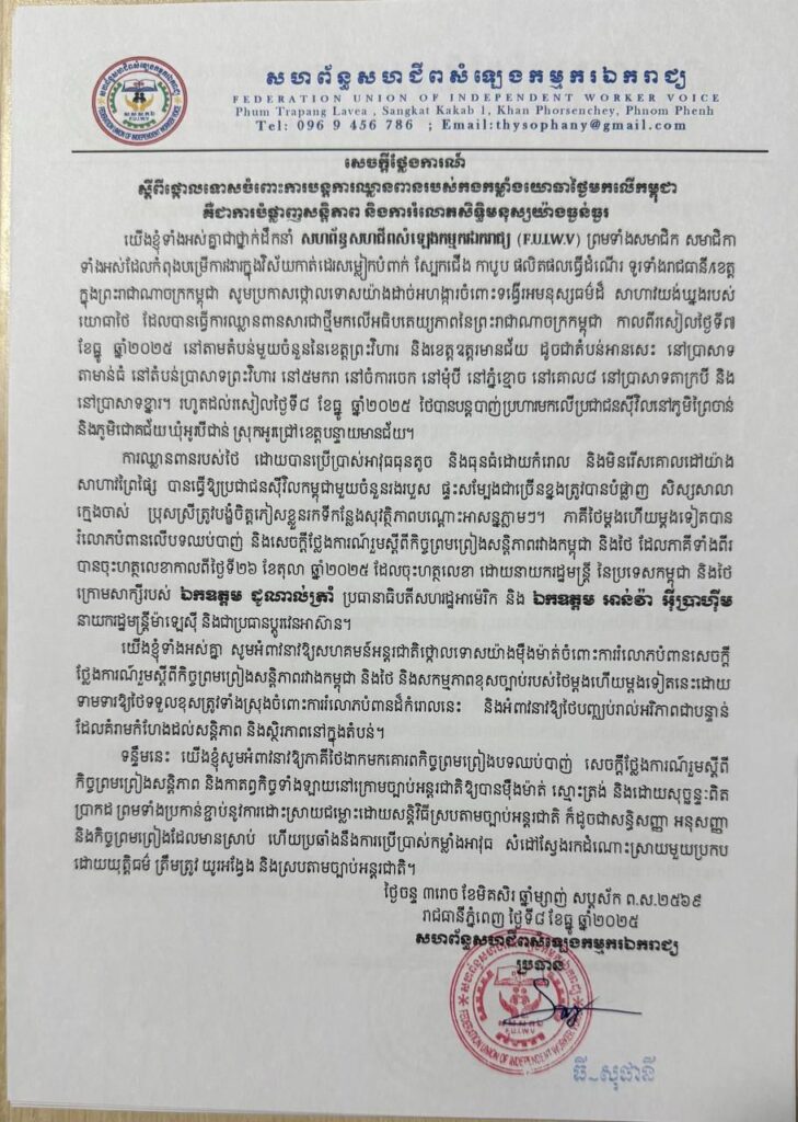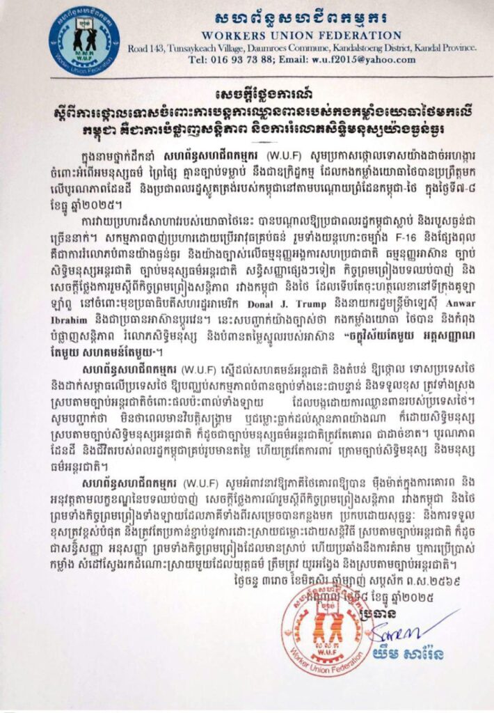 ក្រុមសហជីពទាំងនោះ បានថ្កោលទោសយ៉ាងដាច់អហង្ការ ចំពោះទង្វើអមនុស្សធម៌ដ៏សាហាវយង់ឃ្នងរបស់យោធាថៃ ដែលបានធ្វើការឈ្លានពានសារជាថ្មី មកលើអធិបតេយ្យភាពកម្ពុជា។ ការឈ្លានពានរបស់ថៃ ដោយបានប្រើប្រាស់អាវុធធុនតូច និងធុនធំ ដោយកំរោលនិងមិនរើសគោលដៅ យ៉ាងសាហាវព្រៃផ្សៃ បានធ្វើឱ្យប្រជាជនស៊ីវិលកម្ពុជាមួយចំនួនរងរបួស ផ្ទះសម្បែងជាច្រើនខ្នងត្រូវបានបំផ្លាញ សិស្សសាលា ក្មេងចាស់ ប្រុសស្រីត្រូវបង្ខំចិត្តភៀសខ្លួនរកទីកន្លែងសុវត្ថិភាពបណ្តោះអាសន្នភ្លាមៗ។
