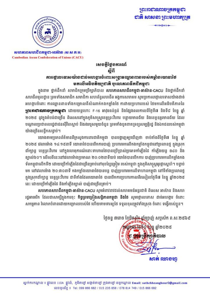 ក្រុមសហជីពនៅកម្ពុជា ចេញញត្តិថ្កោលទោសយោធាថៃ ដែលបានធ្វើការឈ្លានពាន សារជាថ្មី មកលើអធិបតេយ្យភាពកម្ពុជា