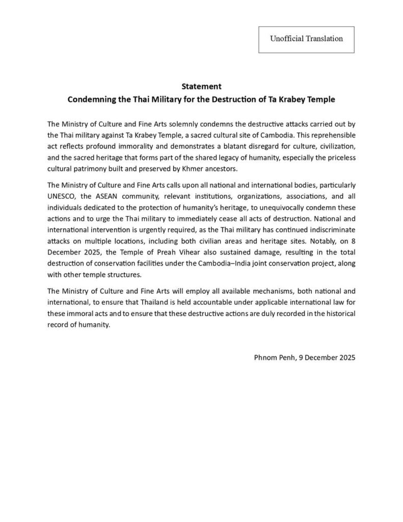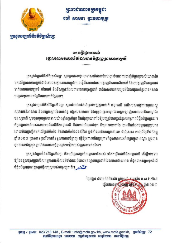 ក្រសួងវប្បធម៌កម្ពុជា អំពាវនាវដល់គ្រប់មជ្ឈដ្ឋានជាតិ អន្តរជាតិ ចូលរួមថ្កោលទោស និងជំរុញយោធាថៃ ឱ្យបញ្ឈប់ជាបន្ទាន់ នូវសកម្មភាពបំផ្លិចបំផ្លាញបេតិកភណ្ឌ នៃមនុស្សជាតិ