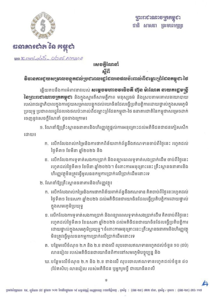 ភ្នំពេញ ៖ ធនាគារជាតិនៃកម្ពុជា នៅថ្ងៃទី១០ ខែធ្នូ ឆ្នាំ២០២៥នេះ បានចេញសេចក្ដីណែនាំពីវិធានការជួយសម្រាលបន្ទុក ដល់ប្រជាពលរដ្ឋដែលរងផលប៉ះពាល់ពីជម្លោះព្រំដែនកម្ពុជា-ថៃ