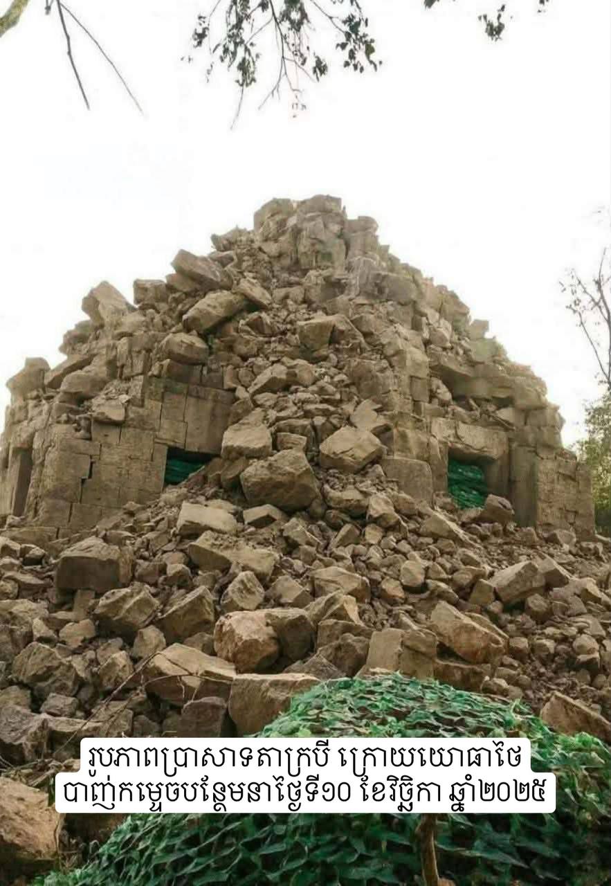 ភ្នំពេញ ៖ បន្ទាប់ពីទទួលរង ការបាញ់បំផ្លាញយ៉ាងធ្ងន់ធ្ងរ ពីសំណាក់យោធាថៃ កាលពីថ្ងៃទី៩ ខែធ្នូ ឆ្នាំ២០២៥ ប្រាសាទតាក្របី ជាទីសក្ការៈរបស់កម្ពុជា បន្តទទួលរងការបាញ់ កម្ទេចជាថ្មី បណ្តាលឱ្យរូបរាង និងរចនាសម្ព័ន្ធប្រាសាទ ត្រូវបានបំផ្លាញទាំងស្រុង នាថ្ងៃទី១០ ខែធ្នូ ឆ្នាំ២០២៥ ទោះបីជា ក្រសួងវប្បធម៌ និងវិចិត្រសិល្បៈ បានអំពាវនាវ រួចហើយក៏ដោយ ៕
