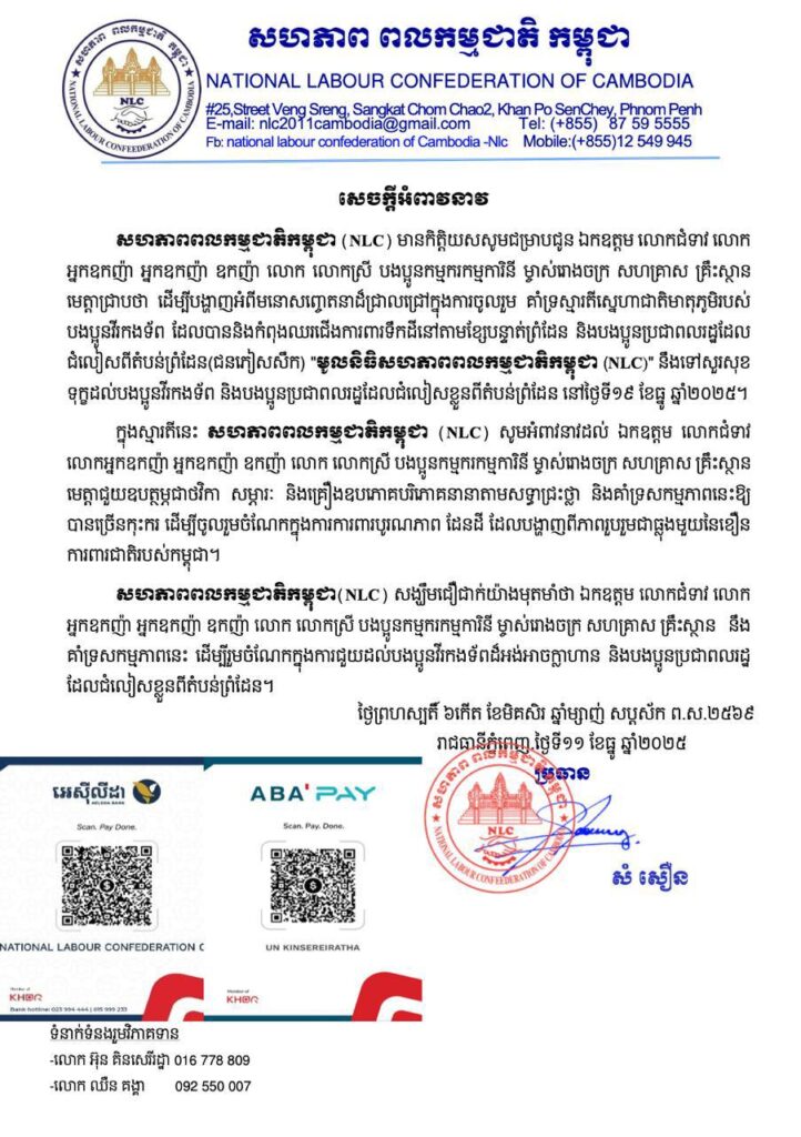 សេចក្ដីអំពាវនាវ របស់សហភាពពលកម្មជាតិកម្ពុជា នៅថ្ងៃទី១១ ខែធ្នូ បានឱ្យដឹងថា ដើម្បីបង្ហាញអំពីមនោសញ្ចេតនាដ៏ជ្រាលជ្រៅ ក្នុងការចូលរួមគាំទ្រស្មារតី ស្នេហាជាតិមាតុភូមិ របស់បងប្អូនវីរកងទ័ពកម្ពុជា ដែលបាននិងកំពុងឈរជើងការពារទឹកដី នៅតាមខ្សែបន្ទាត់ព្រំដែន និងបងប្អូនប្រជាពលរដ្ឋ ដែលជម្លៀសពីតំបន់ព្រំដែន (ជនភៀសសឹក) “មូលនិធិសហភាពពលកម្មជាតិកម្ពុជា (NLC)” នឹងចុះទៅសួរសុខទុក្ខ ដល់បងប្អូនវីរកងទ័ព និងបងប្អូនប្រជាពលរដ្ឋ ដែលជម្លៀសខ្លួនចេញពីតំបន់ព្រំដែន នៅថ្ងៃទី១៩ ខែធ្នូ ឆ្នាំ២០២៥ខាងមុខ។