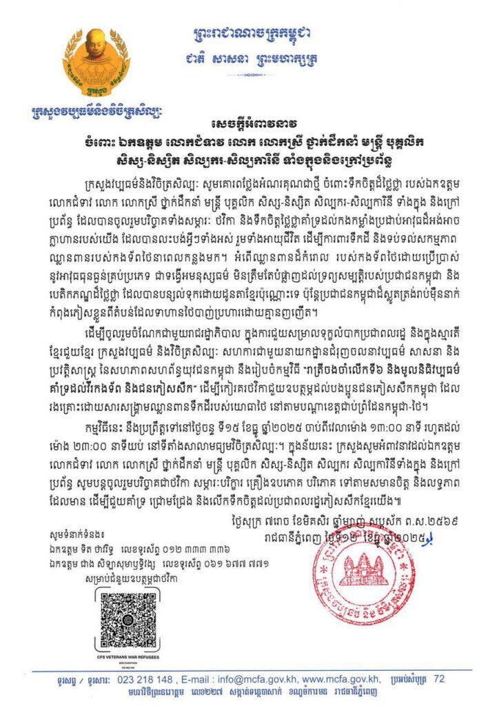 ភ្នំពេញ ៖ ក្រសួងវប្បធម៌និងវិចិត្រសិល្បៈ អំពាវនាវឲ្យសប្បុរសជន ចូលរួមបរិច្ចាគ ទាំងសម្ភារៈ ថវិកា ដើម្បីជួយឧបត្ថម្ភគាំទ្រ ដល់កងកម្លាំងប្រដាប់អាវុធ ដ៏អង់អាចក្លាហាន ដែលបានលះបង់អ្វីៗទាំងអស់ រួមទាំងអាយុជីវិត ដើម្បីការពារទឹកដី និងទប់ទល់សកម្មភាព ឈ្លានពានរបស់កងទ័ពថៃ ព្រមទាំងជួយដល់ភៀសសឹកនាដោយសារសង្រ្គាម នៅតាមបណ្តោយព្រំដែនខ្មែរ-ថៃផងដែរ ៕