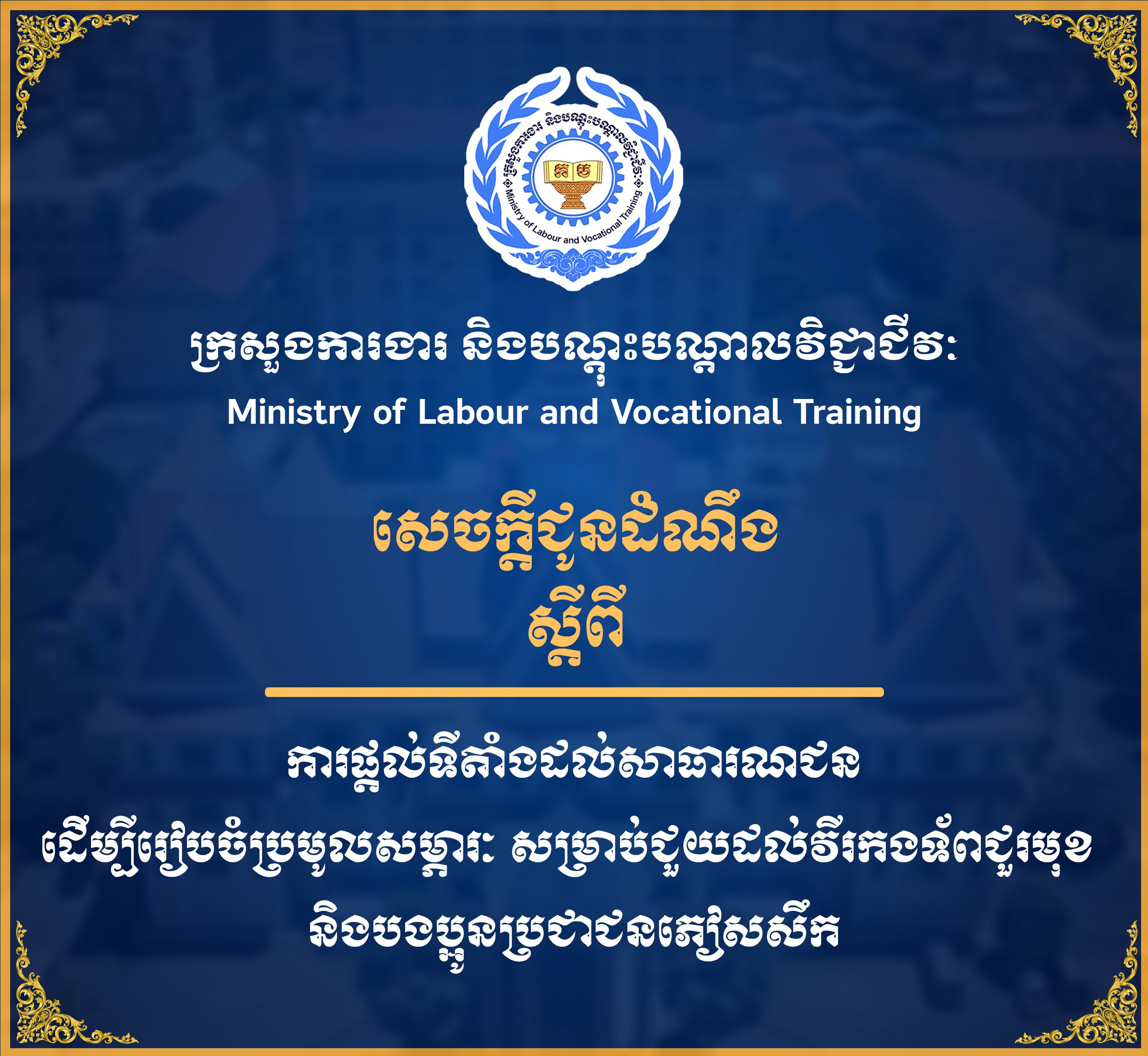 ភ្នំពេញ៖ ក្រសួងការងារ និងបណ្តុះបណ្តាលវិជ្ជាជីវៈ នៅថ្ងៃទី១៤ ខែធ្នូ ឆ្នាំ២០២៥នេះ បានជូនដំណឹងពីការផ្តល់ទីតាំងចំនួន ២កន្លែងជូនដល់សាធារណជន ជាពិសេស យុជន ដែលកំពុងស្វែងរកទីតាំង សម្រាប់រៀបចំប្រមូលសម្ភារៈ ដើម្បីទទួលជំនួយសប្បុរសធម៌ សម្រាប់គាំទ្រដល់វីរកងទ័ពជួរមុខ និងបងប្អូនប្រជាជនភៀសសឹក ដែលរងគ្រោះ ដោយសារសង្រ្គាមឈ្លាន ពានដ៏ឃោរឃៅ ពីសំណាក់យោធាថៃ។