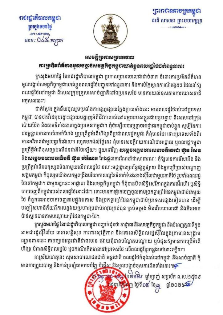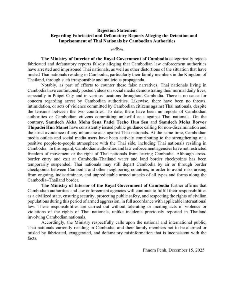 ភ្នំពេញ ៖ ក្រសួងមហាផ្ទៃ នៅយប់ថ្ងៃទី១៥ ខែធ្នូ ឆ្នាំ២០២៥នេះ បានចេញសេចក្ដីប្រកាសច្រានចោលជាដាច់ខាត ចំពោះការប្រឌិតព័ត៌មាន មួលបង្កាច់សមត្ថកិច្ចកម្ពុជាឃាត់ខ្លួនពលរដ្ឋថៃបញ្ជូនទៅពន្ធនាគារ និងការបំភ្លៃស្ថានការណ៍ផ្សេងៗ នាំឱ្យ ពលរដ្ឋថៃនៅកម្ពុជា ពិសេសក្រុមគ្រួសារសាច់ញាតិនៅឯប្រទេសថៃ មានការយល់ខុសតាមការឃោសនាដ៏ អកុសលនេះ។