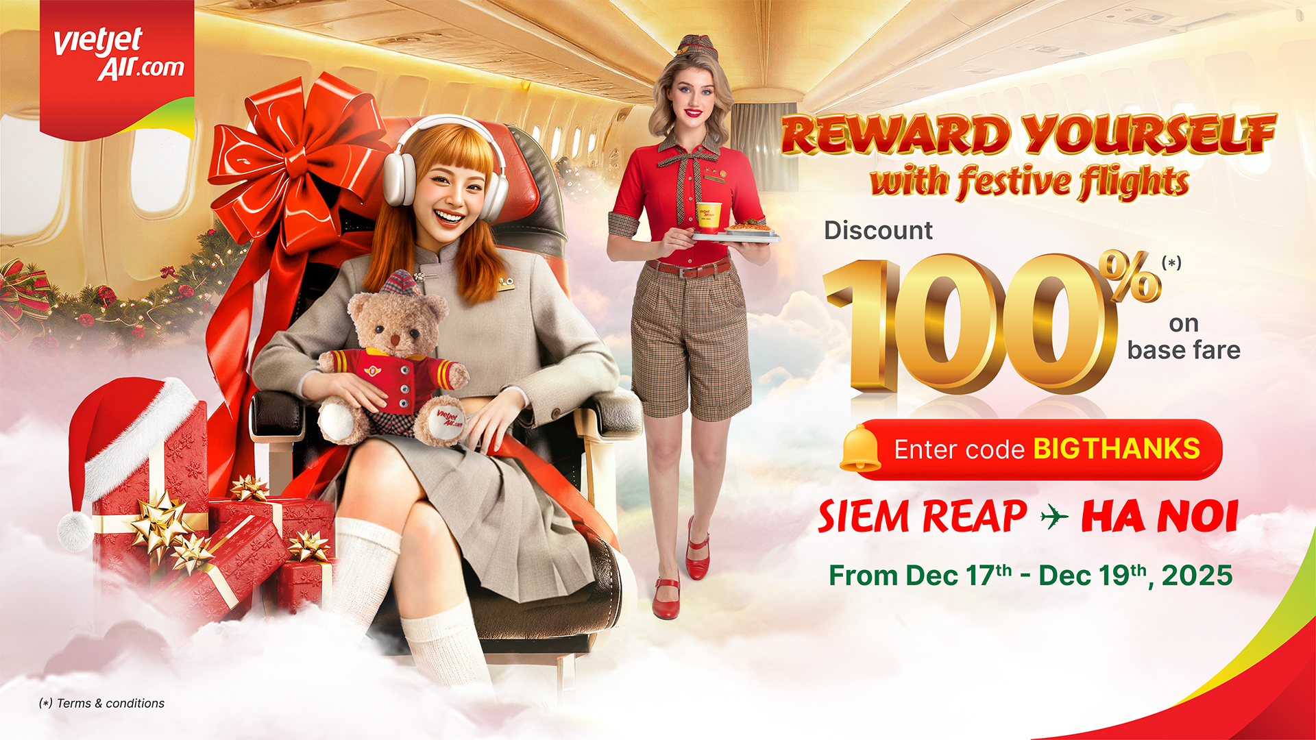 ភ្នំពេញ៖ ថ្ងៃទី១៦ ខែធ្នូ ឆ្នាំ២០២៥ – ក្រុមហ៊ុនអាកាសចរណ៍ Vietjet កំពុងអញ្ជើញអ្នកធ្វើដំណើរពីប្រទេសកម្ពុជាដើម្បីផ្តល់រង្វាន់លើកទឹកចិត្តខ្លួនឯងជាមួយនឹងដំណើរកម្សាន្តទៅកាន់ប្រទេសវៀតណាម និងក្រៅប្រទេស ដោយផ្តល់ជូនសំបុត្រយន្តហោះរាប់លានសំបុត្រដែលមានការបញ្ចុះតម្លៃរហូតដល់ ១០០% សម្រាប់រយៈពេលបីថ្ងៃតែប៉ុណ្ណោះ។