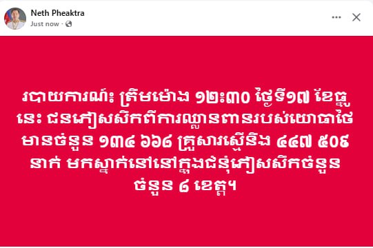 ភ្នំពេញ ៖ លោក នេត្រ ភក្រ្តា រដ្ឋមន្រ្តីក្រសួងព័ត៌មាន បានឲ្យដឹងថា បើយោងតាមរបាយការណ៍គិតត្រឹមម៉ោង ១២៖៣០ រសៀលថ្ងៃទី១៧ ខែធ្នូនេះ ជនភៀសសឹកពីការឈ្លានពានរបស់យោធាថៃមានចំនួន ១៣៤ ៦៦៨ គ្រួសារស្មើនឹង ៤៤៧ ៥០៩ នាក់ មកស្នាក់នៅក្នុងជំនុំភៀសសឹកចំនួន ៨ ខេត្ត៕