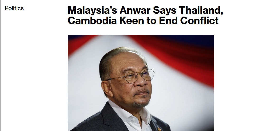 Bloomberg ៖ លោក អាន់វ៉ា អ៊ីប្រាហ៊ីម នាយករដ្ឋមន្ត្រីម៉ាឡេស៊ី បានបង្ហាញនូវសញ្ញាថ្មី ក្នុងដោះស្រាយជម្លោះព្រំដែនកម្ពុជា-ថៃ ដោយលោកបានទាក់ទងជាមួយ សម្ដេចធិបតីហ៊ុន ម៉ាណែត នាយករដ្ឋមន្រ្តីនៃកម្ពុជា និងលោកអនុទីន នាយករដ្ឋមន្រ្តីថៃ ដោយបង្ហាញពីបំណងចង់ដោះស្រាយជម្លោះព្រំដែន ឱ្យបានឆាប់ តាមដែលអាចធ្វើទៅបាន។