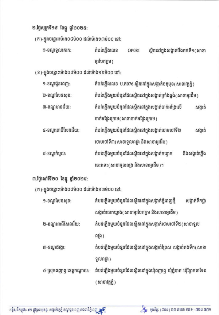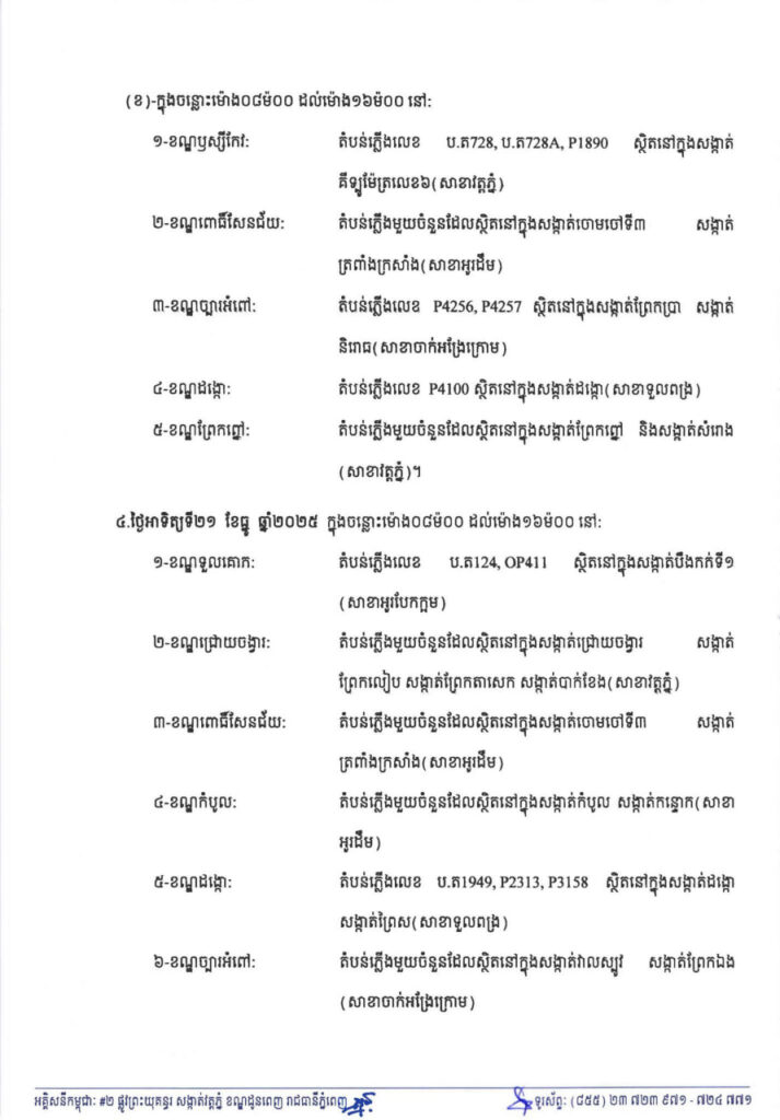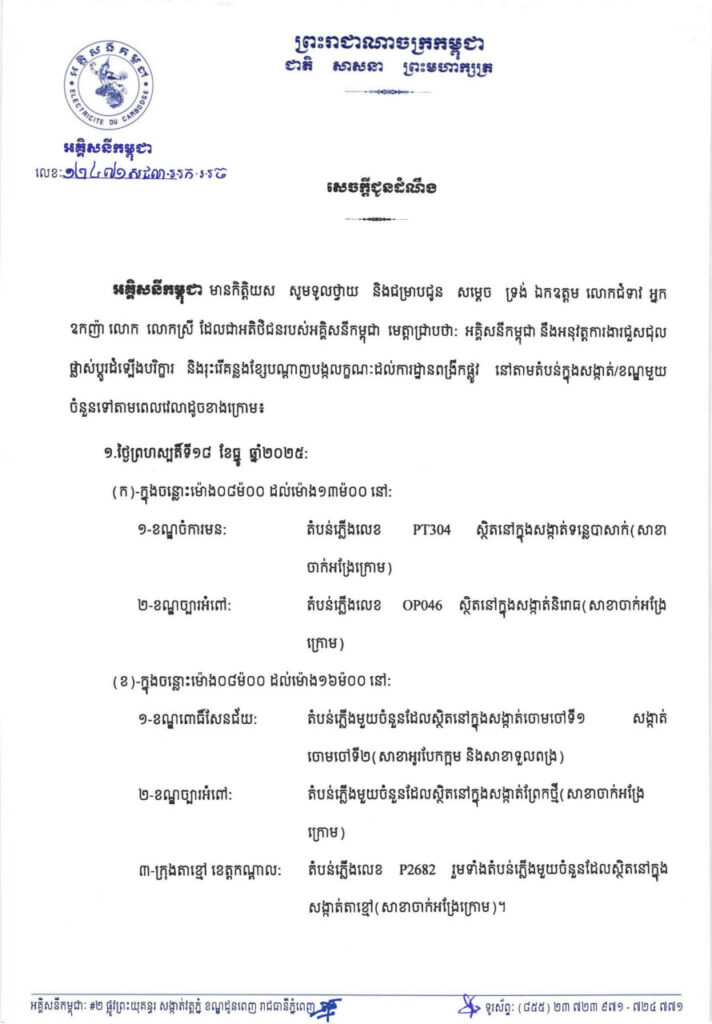 EDC ជូនដំណឹងពីការរអាក់រអួលចរន្ត តាមតំបន់សង្កាត់ ខណ្ឌ មួយចំនួនចាប់ពីថ្ងៃនេះ ដល់ថ្ងៃទី២១ ខែធ្នូ ឆ្នាំ២០២៥ ដើម្បីរុះរើគន្លងខ្សែបណ្តាញ ផ្លាស់ប្តូរ តម្លើង បរិក្ខារ ងាយស្រួលដល់ការដ្ឋានពង្រីកផ្លូវ