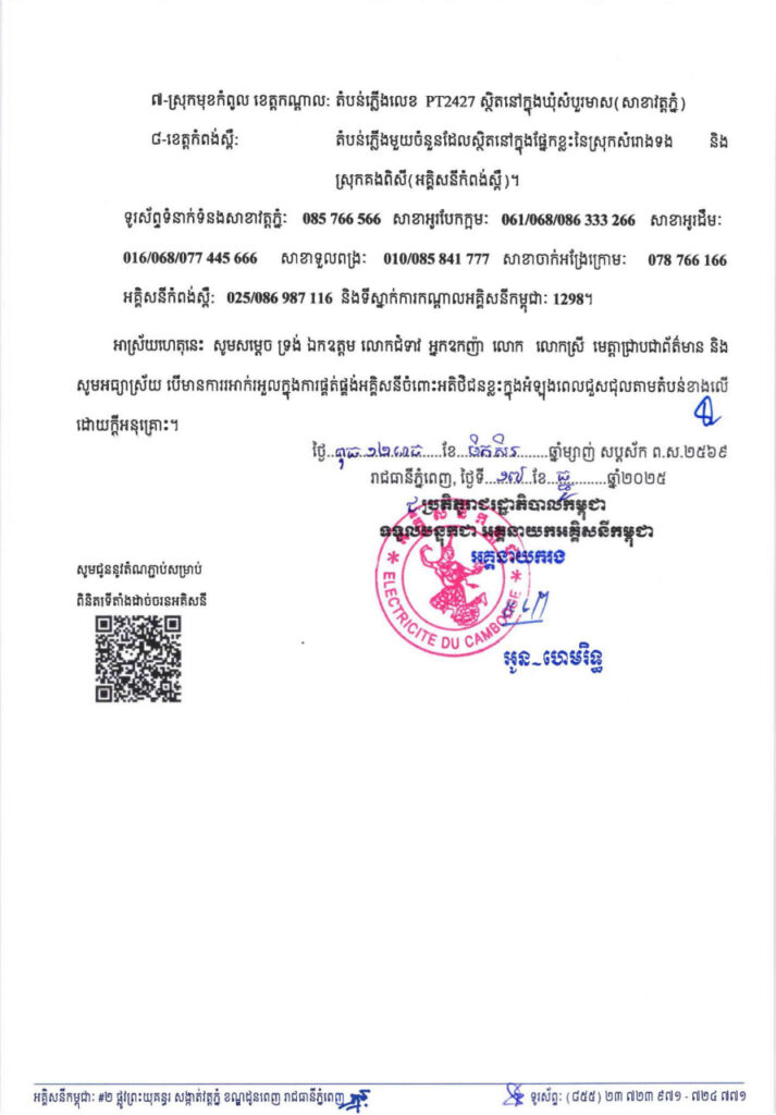 សូមអានសេចក្តីជូនដំណឹង របស់អគ្គិសនីកម្ពុជា ដូចខាងក្រោម ៖