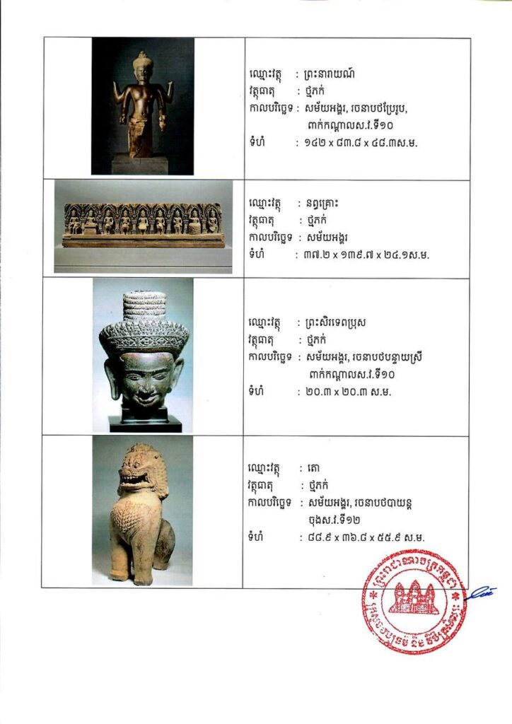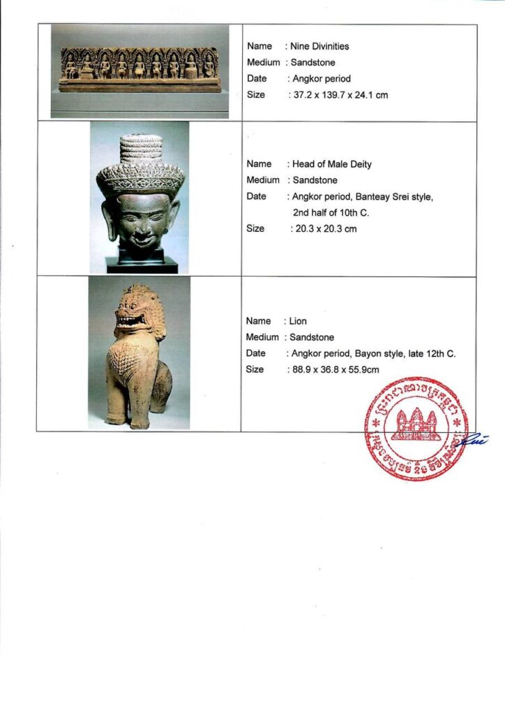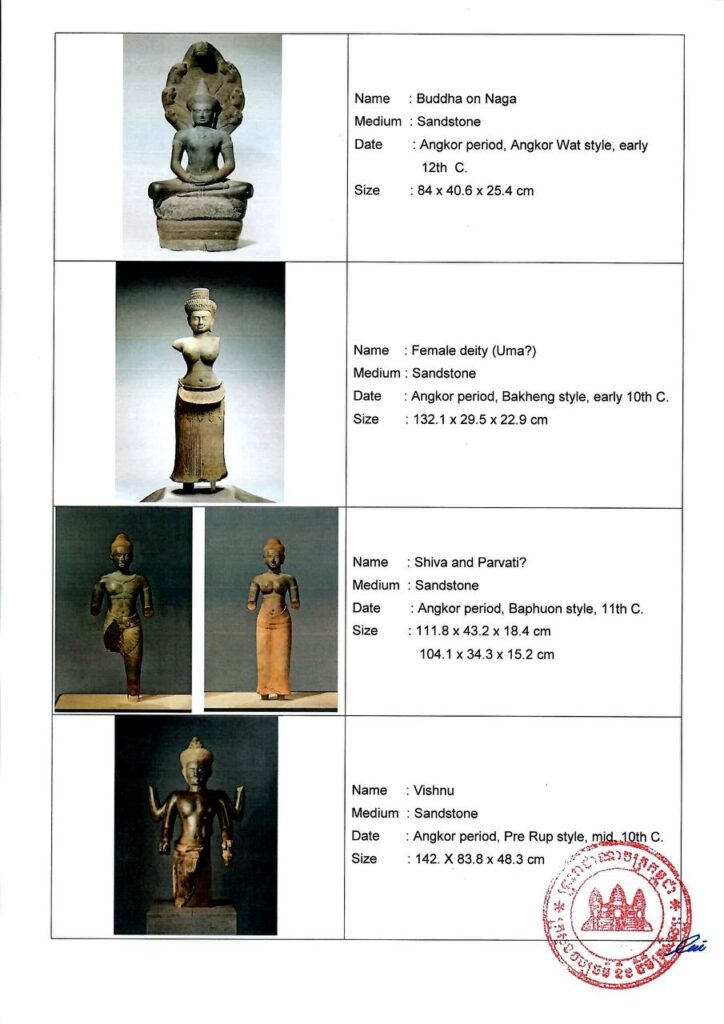 ក្នុងចំណោមវត្ថុទាំង១៣រូបនេះ មានដូចជា ៖ បដិមាជាទេវរូប ព្រះសិរទេពប្រុស ចម្លាក់តោ និងចម្លាក់ គ្រឿងបង្គំ ប្រាសាទនានា ។ តាមរយៈការសិក្សាវិភាគលើភស្តុតាង ដោយមន្ត្រីជំនាញសារមន្ទីរ និងក្រុមអ្នកស៊ើបអង្កេត បានបញ្ជាក់ថា វត្ថុទាំងនេះ មានជាប់ពាក់ព័ន្ធនឹងបណ្តាញទំនាក់ទំនងជាមួយ លោក ខូក្លាស ឡាតហ្វដ (Douglas Latchford) ដែលបានលួចនាំចេញពីកម្ពុជា ក្នុងអំឡុងសង្គ្រាមស៊ីវិល និងអសន្តិសុខ។
