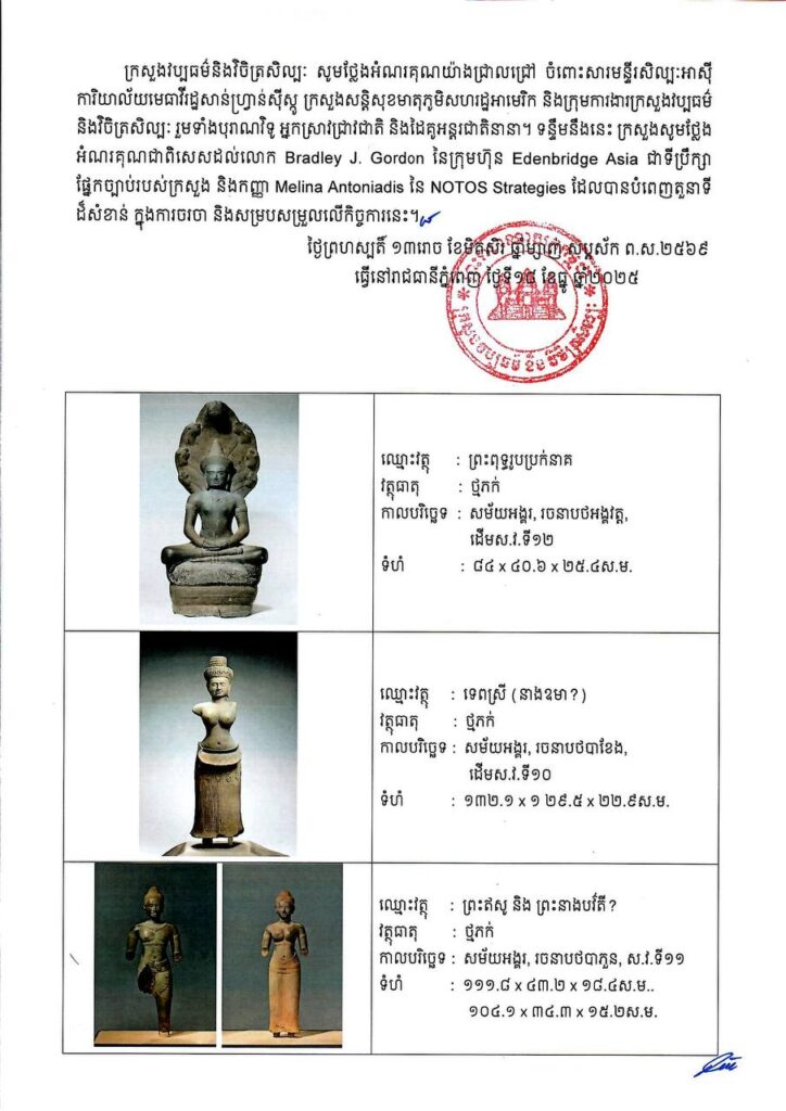 យោងតាមសេចក្តីប្រកាសព័ត៌មានរបស់ក្រសួងវប្បធម៌ នៅថ្ងៃទី១៨ ខែធ្នូ បានឲ្យដឹងថា ការសម្រេចផ្តល់ឲ្យជាផ្លូវការនេះ បន្ទាប់ពីគណៈកម្មការសិល្បៈអាស៊ី បានបោះឆ្នោតយល់ព្រមជាឯកច្ឆន្ទ កាលពីថ្ងៃទី២៤ ខែកញ្ញា ឆ្នាំ២០២៥ ដោយបញ្ជាក់ថា វត្ថុបុរាណខ្មែរ ដ៏វិចិត្រទាំង ៣៣រូប បាននាំចេញពីកម្ពុជាដោយខុសច្បាប់ ដែលជាការបំពាន លើច្បាប់ សហព័ន្ធ និងផ្អែកលើភស្តុតាងនានា ដែលរកឃើញដោយភ្នាក់ងារ សន្តិសុខមាតុភូមិសហរដ្ឋអាមេរិក រួមទាំងក្រុមស្រាវជ្រាវកម្ពុជា និងក្រុមការងារសារមន្ទីរសិល្បៈអាស៊ី។