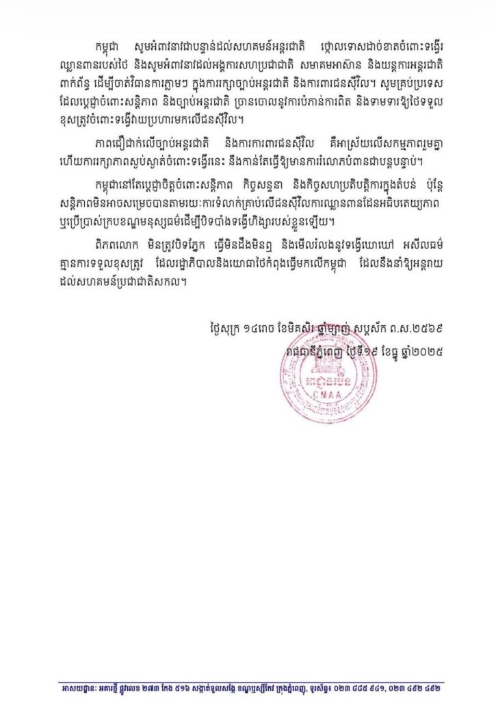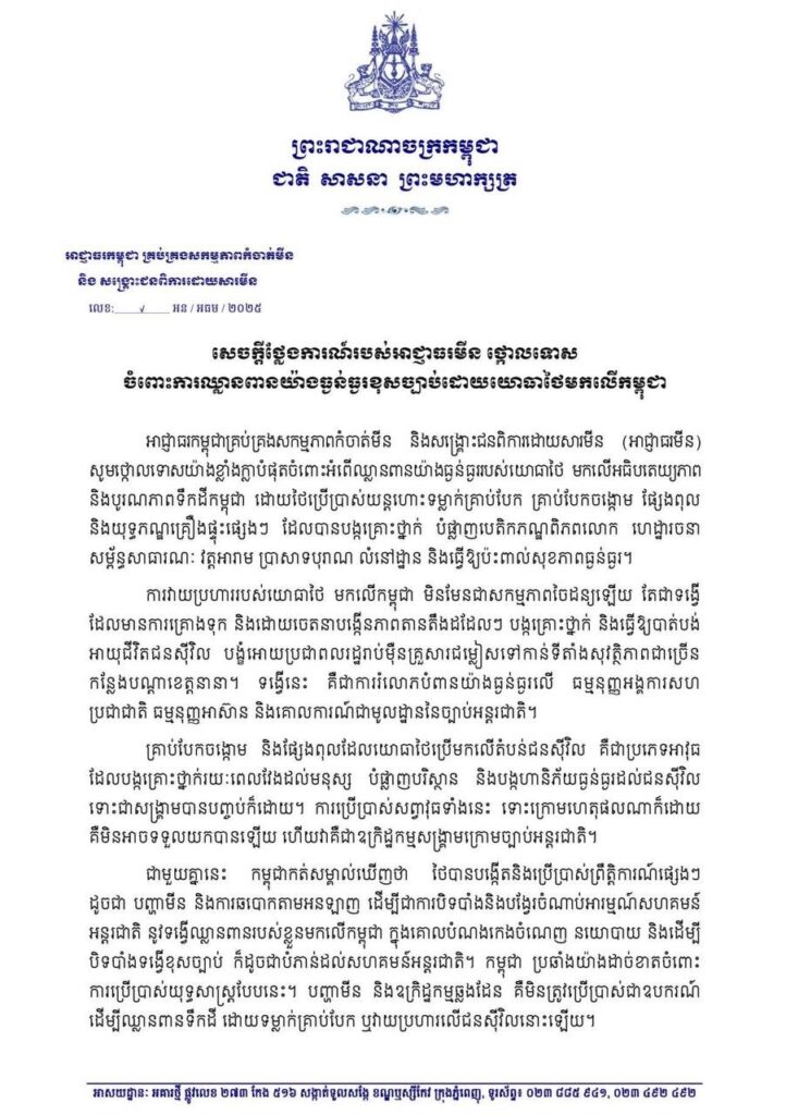 ភ្នំពេញ ៖ អាជ្ញាធរមីនកម្ពុជា បានថ្កោលទោសយ៉ាងខ្លាំងក្លាបំផុតចំពោះអំពើឈ្លានពានយ៉ាងធ្ងន់ធ្ងររបស់យោធាថៃ មកលើអធិបតេយ្យភាព និងបូរណភាពទឹកដីកម្ពុជា ដោយថៃប្រើប្រាស់យន្តហោះទម្លាក់គ្រាប់បែក គ្រាប់បែកចង្កោម ផ្សែងពុល និងយុទ្ធភណ្ឌគ្រឿងផ្ទុះផ្សេងៗ ដែលបានបង្កគ្រោះថ្នាក់ បំផ្លាញបេតិកភណ្ឌពិភពលោក ហេដ្ឋារចនាសម្ព័ន្ធសាធារណៈ វត្តអារាម ប្រាសាទបុរាណ លំនៅដ្ឋាន និងធ្វើឱ្យប៉ះពាល់សុខភាពធ្ងន់ធ្ងរ៕