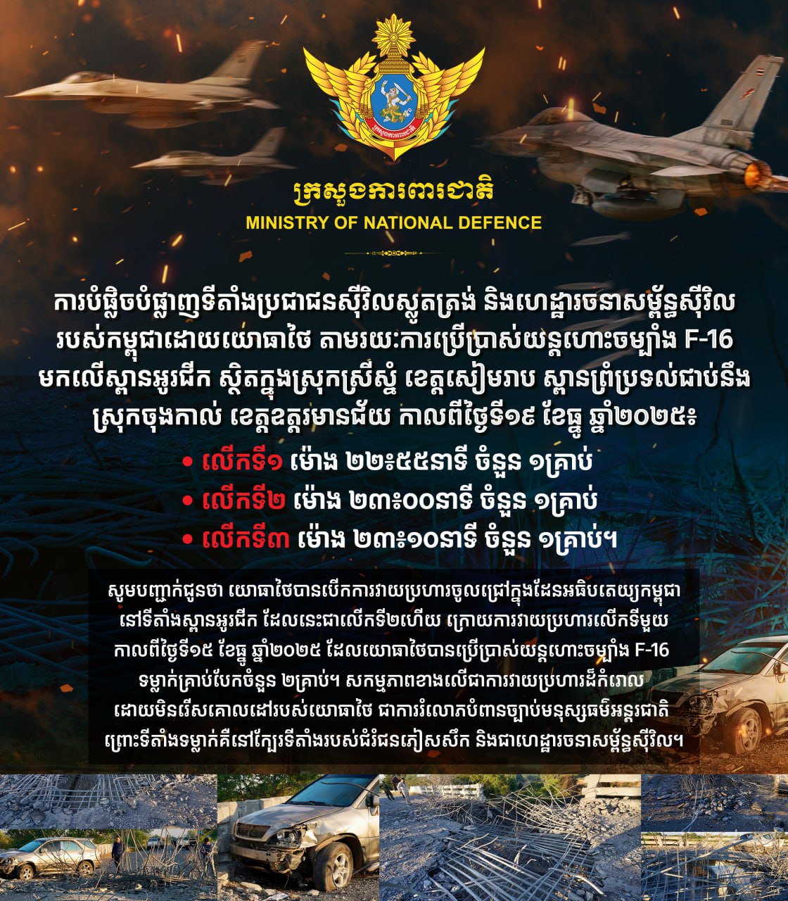 ភ្នំពេញ ៖ ក្រសួងការពារជាតិបានឲ្យដឹងថា យោធាថៃ បានប្រើប្រាស់យន្តហោះចម្បាំង F-16 មកលើស្ពានអូរជីក ស្ថិតក្នុងស្រុកស្រីស្នំ ខេត្តសៀមរាប មានព្រំប្រទល់ជាប់នឹងស្រុកចុងកាល់ ខេត្តឧត្តរមានជ័យ ចំនួន៣លើក កាលពីថ្ងៃទី១៩ ខែធ្នូ ឆ្នាំ២០២៥ ។