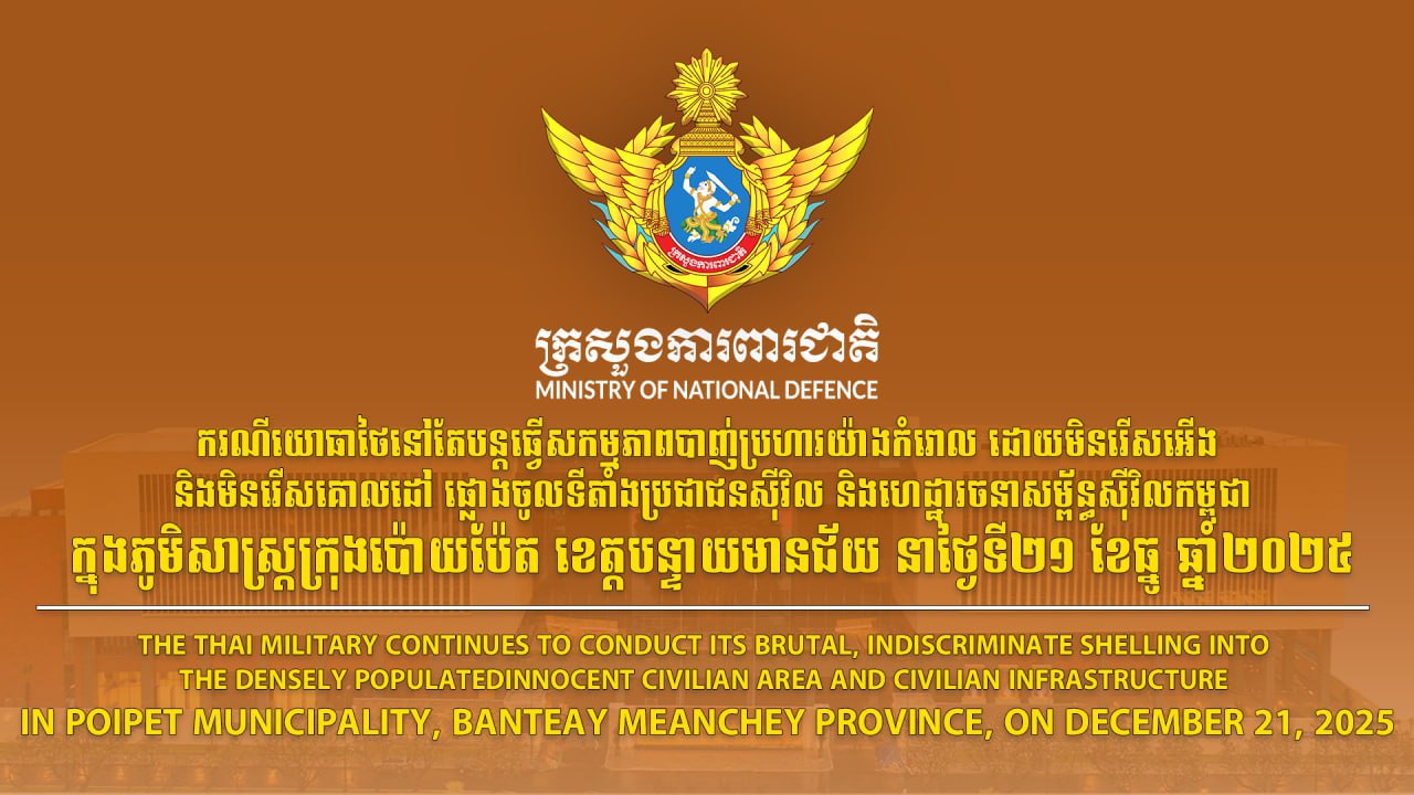 ភ្នំពេញ ៖ ក្រសួងការពារជាតិ បានឲ្យដឹងថា ករណីយោធាថៃ នៅតែបន្តធ្វើសកម្មភាពបាញ់ប្រហារយ៉ាងកំរោល ដោយមិនរើសអើង និងមិនរើសគោលដៅ ផ្លោងចូលទីតាំងប្រជាជនស៊ីវិល និងហេដ្ឋារចនាសម្ព័ន្ធស៊ីវិលកម្ពុជាក្នុងភូមិសាស្រ្តក្រុងប៉ោយប៉ែត ខេត្តបន្ទាយមានជ័យ នាថ្ងៃទី២១ ខែធ្នូ ឆ្នាំ២០២៥៖