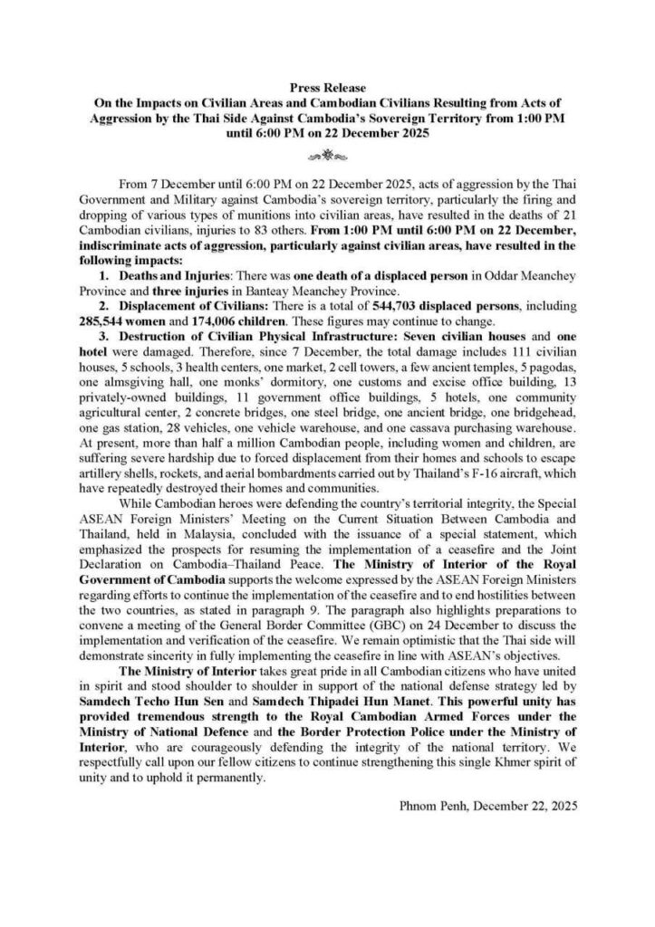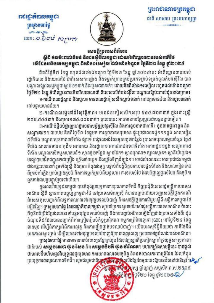 ភ្នំពេញ ៖ ក្រសួងមហាផ្ទៃកម្ពុជា បានឲ្យដឹងថា គិតចាប់ពីថ្ងៃទី៧ ដល់ ២២ ខែធ្នូ ឆ្នាំ២០២៥ អំពើឈ្លានពានរបស់រដ្ឋាភិបាល និងយោធាថៃ ជាពិសេសការផ្លោង និងទម្លាក់គ្រាប់គ្រប់ប្រភេទគ្រប់ទម្រង់ចូលតំបន់ស៊ីវិល បានបណ្តាលឱ្យពលរដ្ឋកម្ពុជាស្លាប់ ២១នាក់ និងរបួស ៨៣នាក់៕