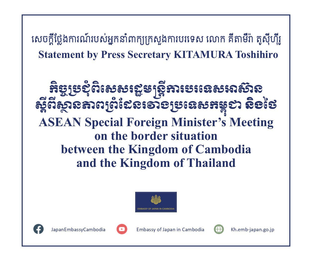 តាមរយៈសេចក្តីថ្លែងការណ៍ របស់អ្នកនាំពាក្យក្រសួង ការបរទេសជប៉ុន ពាក់ព័ន្ធនឹង កិច្ចប្រជុំពិសេសរដ្ឋមន្ត្រី ការបរទេសអាស៊ាន ស្តីពីស្ថានភាពព្រំដែន រវាងប្រទេសកម្ពុជា-ថៃ នាថ្ងៃទី២២ ធ្នូ ថា រដ្ឋាភិបាលជប៉ុនសូមសម្តែង ការព្រួយបារម្ភយ៉ាងខ្លាំង ចំពោះស្ថានភាពនៃការប៉ះទង្គិចយោធារវាងប្រទេសកម្ពុជា និងថៃបានកើនឡើងម្តងទៀត ចាប់តាំងពីខែធ្នូមក ដែលបណ្តាលឱ្យមានអ្នកស្លាប់ និងរបួសក្នុងនោះរួមមានជនស៊ីវិល ជនភៀសសឹក ជាច្រើន រួមទាំងការខូចខាតហេដ្ឋារចនាសម្ព័ន្ធស៊ីវិល នៅក្នុងប្រទេសទាំងពីរ។