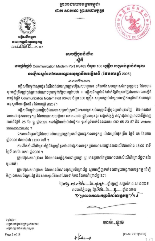ភ្នំពេញ ៖ អគ្គិសនីកម្ពុជា សូមជូនដំណឹង ដល់បណ្តាក្រុមហ៊ុន/សហគ្រាស (គិតទាំងសហគ្រាសឯកត្តបុគ្គល) ដែលបានចុះបញ្ជីត្រឹមត្រូវ ក្នុងព្រះរាជាណាចក្រកម្ពុជា ឱ្យបានជ្រាបថា ៖ អគ្គិសនីកម្ពុជា នឹងដាក់ឱ្យពិគ្រោះថ្លៃជាសាធារណៈស្តីពី ការផ្គត់ផ្គង់ Communication Modem Port RS485 ចំនួន 100 គ្រឿង សម្រាប់ភ្ជាប់ជាមួយនាឡិកាស្ទង់នៅតាមបណ្តា អនុស្ថានីយអគ្គិសនី (ផែនការឆ្នាំ 2025) ។