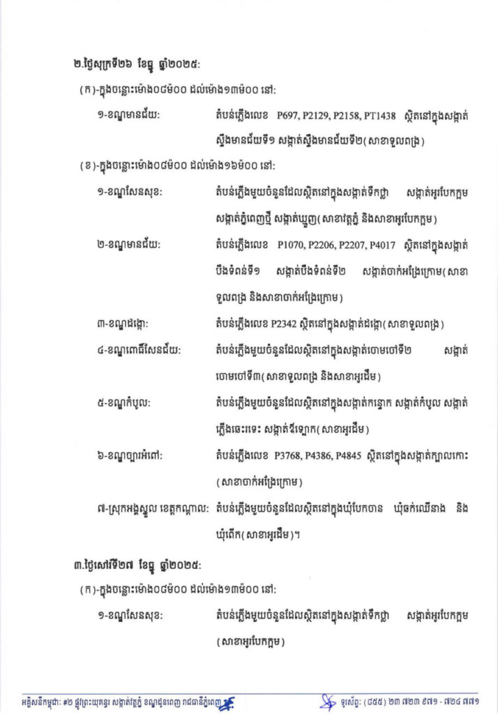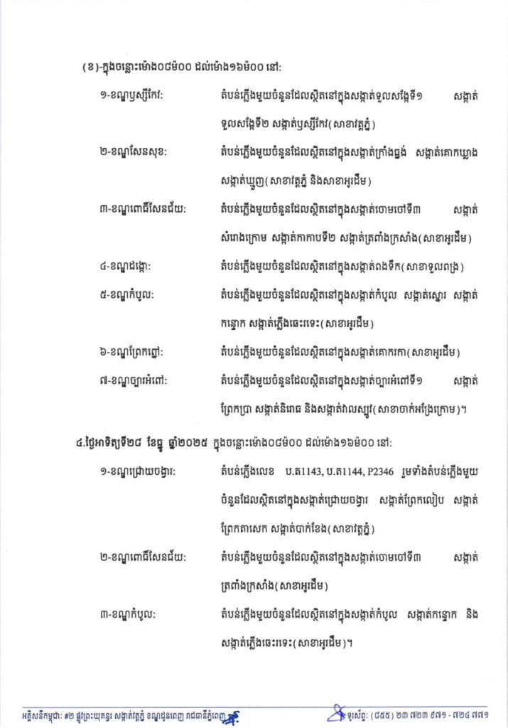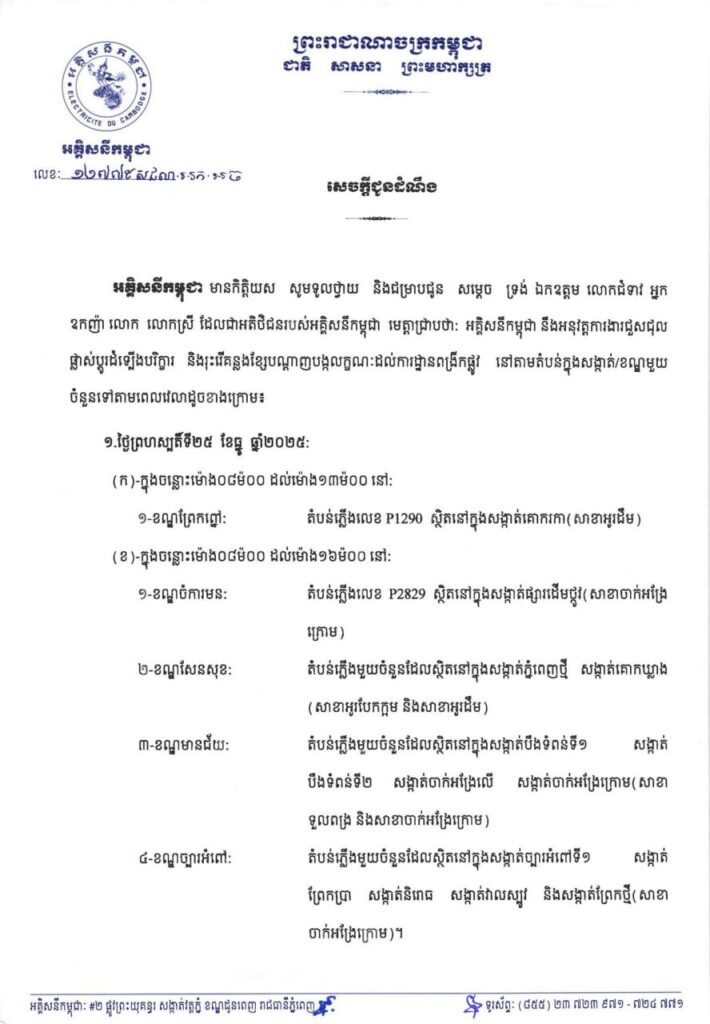 EDC ជូនដំណឹងពីការរអាក់រអួលចរន្ត តាមតំបន់សង្កាត់ ខណ្ឌ មួយចំនួនចាប់ពីថ្ងៃនេះ ដល់ថ្ងៃទី២៨ ខែធ្នូ ឆ្នាំ២០២៥ ដើម្បីរុះរើគន្លងខ្សែបណ្តាញ ផ្លាស់ប្តូរ តម្លើងបរិក្ខារ ងាយស្រួលដល់ការដ្ឋានពង្រីកផ្លូវ