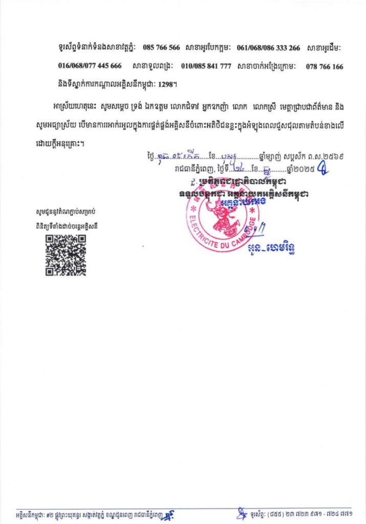 សូមអានសេចក្តីជូនដំណឹង របស់អគ្គិសនីកម្ពុជា ដូចខាងក្រោម ៖