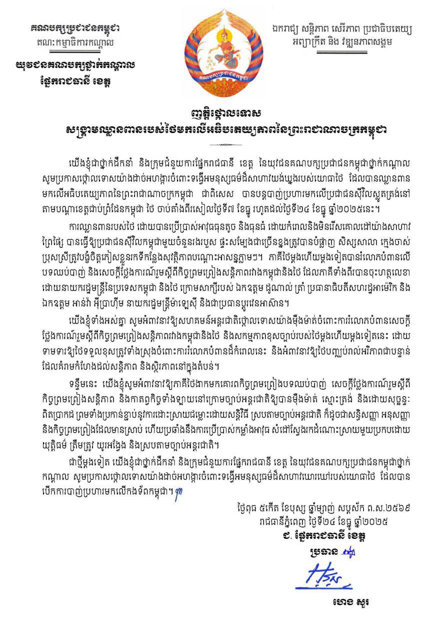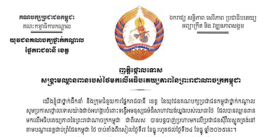 ភ្នំពេញ៖ថ្នាក់ដឹកនាំ និងក្រុមជំនួយការផ្នែករាជធានី ខេត្ត នៃយុវជនគណបក្សប្រជាជនកម្ពុជាថ្នាក់កណ្តាលនៅថ្ងៃទី១៤ ខែធ្នូ ឆ្នាំ២០២៥ បានចេញញត្តិថ្កោលទោសយ៉ាងដាច់អហង្ការចំពោះទង្វើអមនុស្សធម៌ដ៏សាហាវយង់ឃ្នងរបស់យោធាថៃ ដែលបានឈ្លានពានមកលើ អធិបតេយ្យភាពនៃព្រះរាជាណាចក្រកម្ពុជា ជាពិសេស បានបន្តបាញ់ប្រហារមកលើប្រជាជនស៊ីវិលស្លូតត្រង់នៅតាម បណ្តាខេត្តជាប់ព្រំដែនកម្ពុជា ថៃ ចាប់តាំងពីរសៀលថ្ងៃទី៧ ខែធ្នូ រហូតដល់ថ្ងៃទី២៤ ខែធ្នូ ឆ្នាំ២០២៥នេះ។