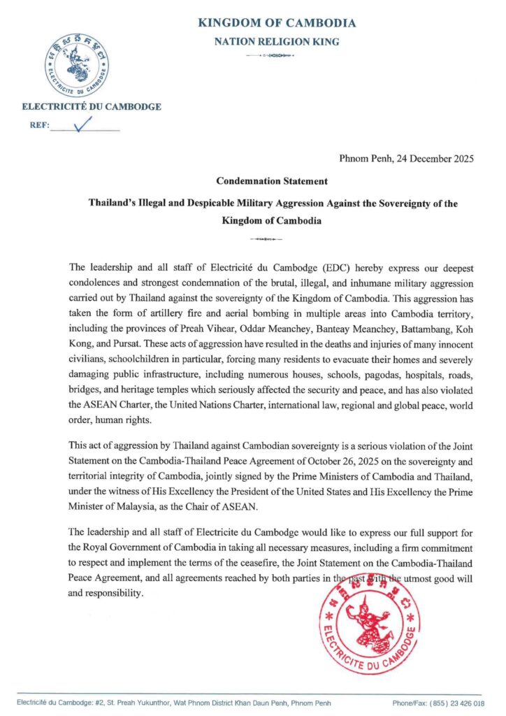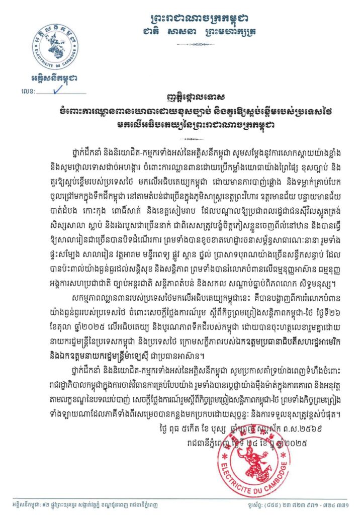 អគ្គិសនីកម្ពុជា ប្រកាសចេញញត្តិថ្កោលទោស សង្គ្រាមឈ្លានពានរបស់ថៃមកលើអធិបតេយ្យភាព នៃព្រះរាជាណាចក្រកម្ពុជា