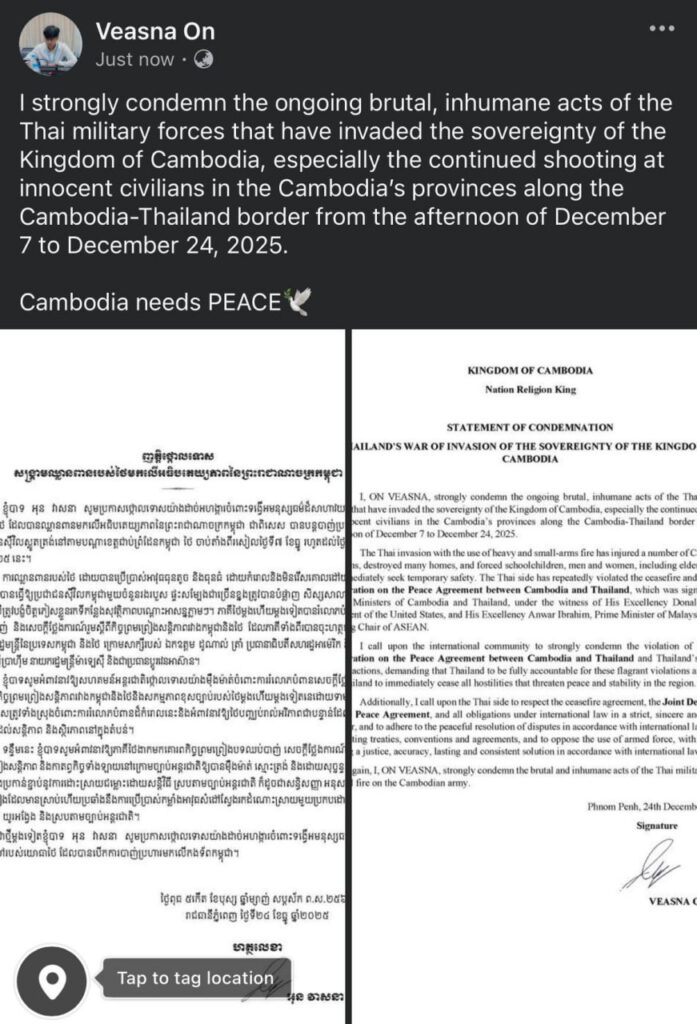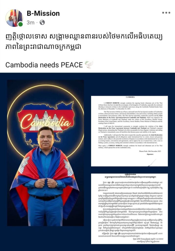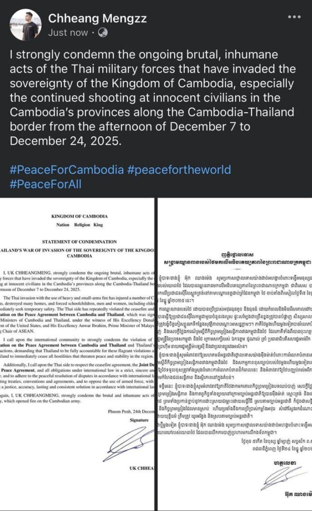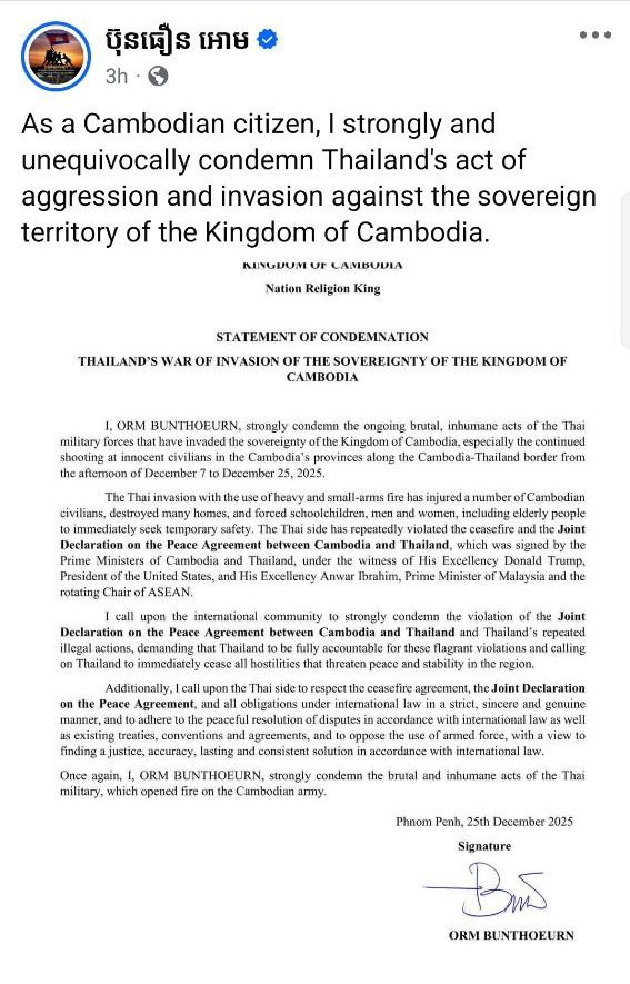 ភ្នំពេញ៖ ប្រជាពលរដ្ឋកម្ពុជានៅថ្ងៃទី២៥ ខែធ្នូ ឆ្នាំ២០២៥នេះ បានចេញញត្តិយ៉ាងផុលផុសបង្ហោះតាមបណ្តាញសង្គមហ្វេសប៊ុក ដើម្បីថ្កោលទោសយ៉ាងដាច់អហង្ការចំពោះទង្វើអមនុស្សធម៌ដ៏សាហាវយង់ឃ្នងរបស់យោធាថៃ ដែលបានឈ្លានពានមកលើ ដែនអធិបតេយ្យភាពនៃព្រះរាជាណាចក្រកម្ពុជា ជាពិសេស បានបន្តបាញ់ប្រហារមកលើប្រជាជនស៊ីវិលស្លូតត្រង់នៅតាម បណ្តាខេត្តជាប់ព្រំដែនកម្ពុជា ថៃ ចាប់តាំងពីរសៀលថ្ងៃទី៧ ខែធ្នូ រហូតដល់ថ្ងៃទី២៥ ខែធ្នូ ឆ្នាំ២០២៥នេះ។
