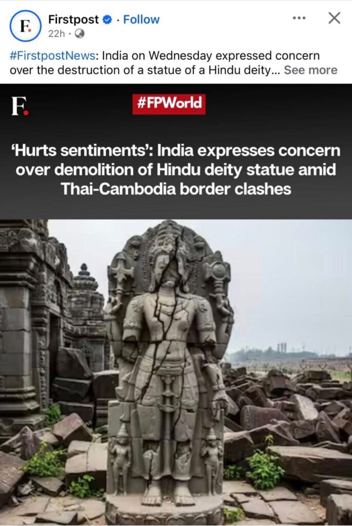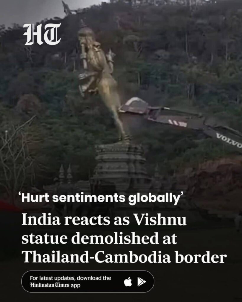 សូមបញ្ជាក់ថា កាលពីថ្ងៃទី២៣ ខែធ្នូ ឆ្នាំ២០២៥ យោធាថៃក្រៅពីមិនអស់ចិត្ត ចំពោះការវាយបំផ្លាញ ហេដ្ឋារចនាសម្ព័ន្ធនានា របស់កម្ពុជាហើយ ថែមទាំង បានបំពានដោយយកគ្រឿង យន្តវាយបំផ្លាញរូប សំណាកអាទិទេពហិណ្ឌូ ដែលកម្ពុជាបានសាង សងកាលពីពេលថ្មីៗនេះ នៅតំបន់អានសេះ ខេត្តព្រះវិហារ ។