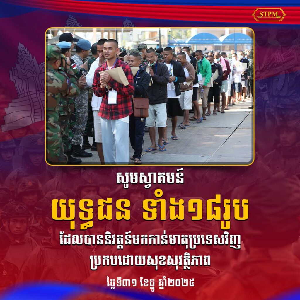 សូមរំលឹកថា តាមរយៈសេចក្ដីប្រកាសព័ត៌មាន លោកស្រី ឧត្តមសេនីយ៍ឯក ម៉ាលី សុជាតា អ្នកនាំពាក្យក្រសួងការពារជាតិ នៃព្រះរាជាណាចក្រកម្ពុជា សូមជម្រាបជូនសាធារណជន អ្នកសារព័ត៌មានជាតិ និងអន្តរជាតិមេត្តាជ្រាបថា នៅច្រកទ្វារព្រំដែនអន្តរជាតិព្រំ ខេត្តប៉ៃលិន វេលាម៉ោង ១០:០០ នាទីព្រឹក ថ្ងៃទី៣១ ខែធ្នូ ឆ្នាំ២០២៥នេះ យោធិនកម្ពុជាទាំង ១៨រូប ដែលបានស្ថិតក្រោមការឃុំគ្រងរបស់ភាគីថៃអស់រយៈពេល ១៥៥ថ្ងៃមកហើយ ត្រូវបានដោះលែង និងបញ្ជូនត្រឡប់មកមាតុប្រទេសវិញ ដោយសុខសុវត្ថិភាព។