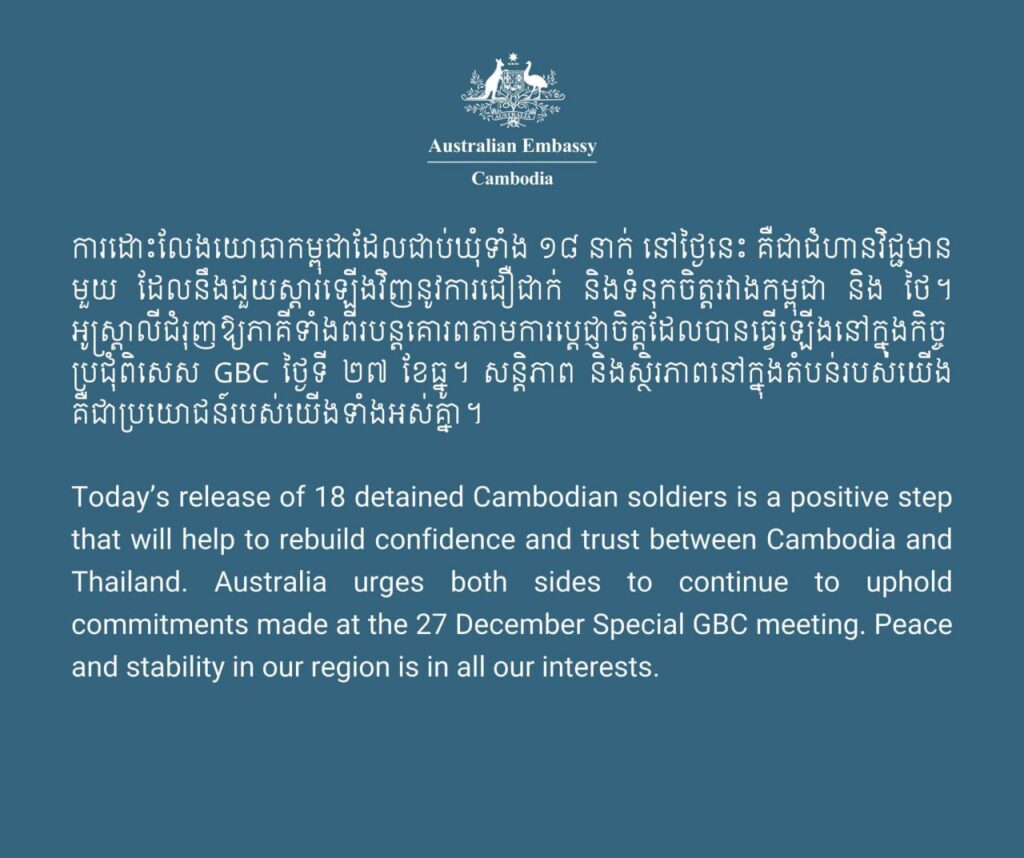 ភ្នំពេញ ៖ ក្រោយការដោះលែងវីរកងទ័ពកម្ពុជា ទាំង១៨រូបរួចមក ស្ថានទូតអូស្រ្តាលីប្រចាំកម្ពុជា បានលើកឡើងថា ការដោះលែងនេះ ជាសញ្ញាវិជ្ជមានមួយ ដែលនឹងជួយដល់ការស្ដារឡើងវិញ នូវការជឿជាក់ និងទំនុកចិត្តរវាងកម្ពុជា-ថៃ ។