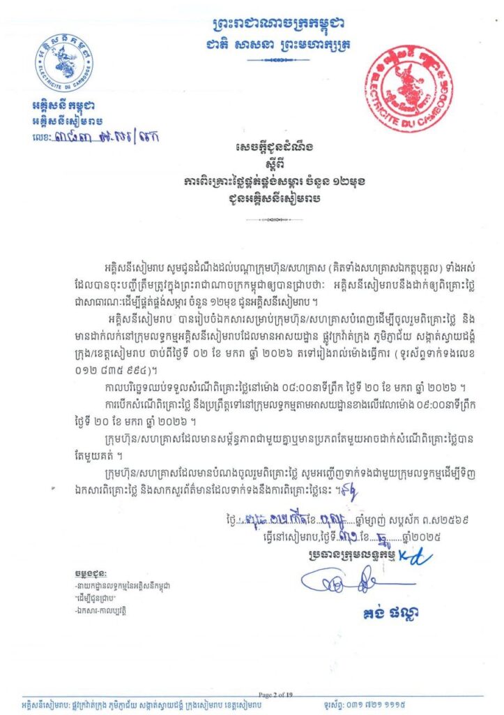 អគ្គិសនីសៀមរាប បានរៀបចំឯកសារ សម្រាប់ក្រុមហ៊ុន/ សហគ្រាសបំពេញ ដើម្បីចូលរួមពិគ្រោះថ្លៃ និង មានដាក់លក់ នៅក្រុមលទ្ធកម្មអគ្គិសនី សៀមរាប ដែលមានអាសយដ្ឋាន ផ្លូវក្រវ៉ាត់ក្រុង ភូមិភ្ញាជ័យ សង្កាត់ស្វាយដង្គំ ក្រុង/ខេត្តសៀមរាប ចាប់ពីថ្ងៃទី ០២ ខែ មករា ឆ្នាំ ២០២៦ តទៅរៀងរាល់ម៉ោងធ្វើការ (ទូរស័ព្ទទាក់ទងលេខ ០១២ ៨៣៥ ៩៩៤)។