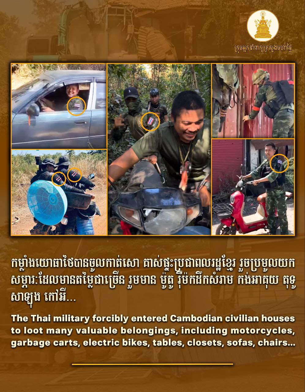ភ្នំពេញ ៖ ក្រសួងមហាផ្ទៃនៃរាជរដ្ឋាភិបាលកម្ពុជា ប្រឆាំងដាច់ខាតចំពោះការវាយកម្ទេចសំណង់ស៊ីវិលរបស់ប្រជាពលរដ្ឋខ្មែរនៅខេត្តជាប់ព្រំដែនកម្ពុជា-ថៃ ពីសំណាក់កងកម្លាំងប្រដាប់អាវុធថៃ ។