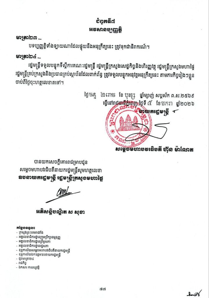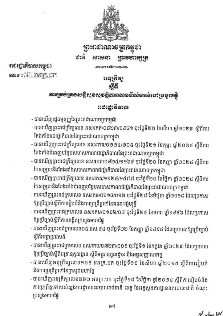 ភ្នំពេញ៖ ប្រមុខរាជរដ្ឋាភិបាលកម្ពុជា សម្ដេចធិបតី ហ៊ុន ម៉ាណែត ចេញអនុក្រឹត្យ ស្ដីពី ការគ្រប់គ្រងសន្ដិសុខសុវត្ថិភាព តាមទីតាំងរស់នៅប្រមូលផ្ដុំ។