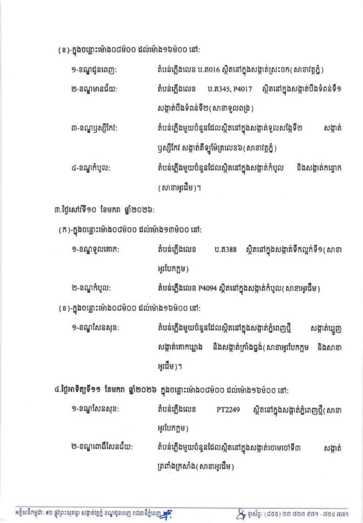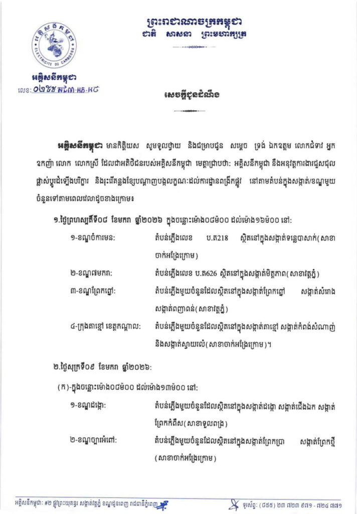 EDC ជូនដំណឹងពីការរអាក់រអួលចរន្ត តាមតំបន់សង្កាត់ ខណ្ឌ មួយចំនួនចាប់ពីថ្ងៃនេះ ដល់ថ្ងៃទី១១ ខែមករា ឆ្នាំ២០២៦ ដើម្បីរុះរើគន្លងខ្សែបណ្តាញ ផ្លាស់ប្តូរ តម្លើង បរិក្ខារ ងាយស្រួលដល់ការដ្ឋានពង្រីកផ្លូវ
