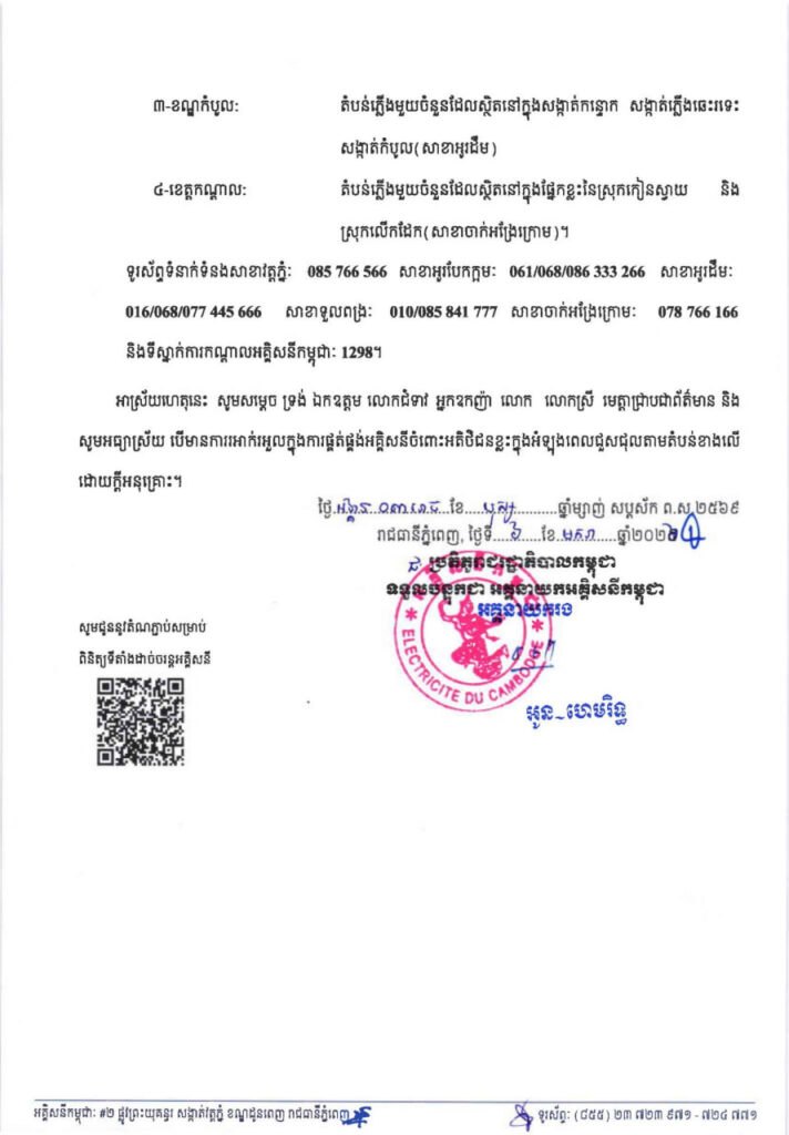 សូមអានសេចក្តីជូនដំណឹង របស់អគ្គិសនីកម្ពុជា ដូចខាងក្រោម ៖