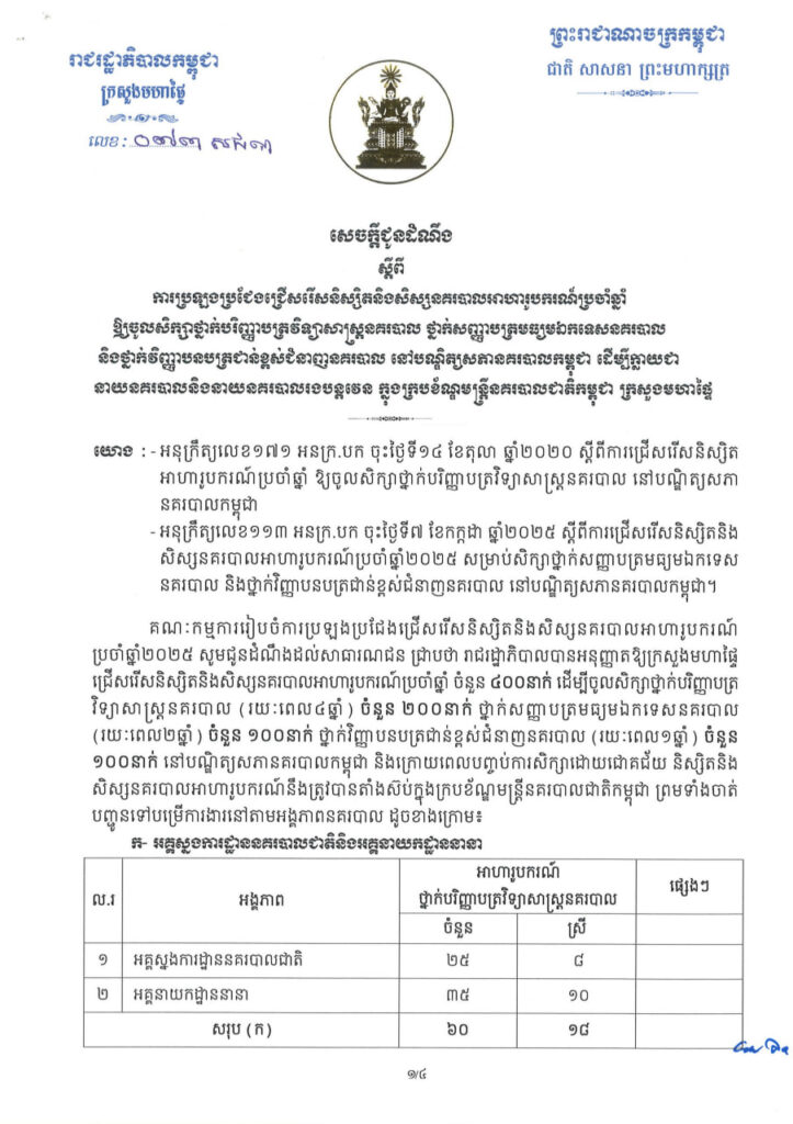 ភ្នំពេញ ៖ ក្រសួងមហាផ្ទៃ ចេញសេចក្តី ជូនដំណឹង ស្តីពី ការប្រឡងប្រជែងជ្រើសរើសនិស្សិត និង សិស្សនគរបាល អាហារូបករណ៍ប្រចាំឆ្នាំ ឱ្យចូលសិក្សាថ្នាក់ បរិញ្ញាបត្រវិទ្យាសាស្ត្រនគរបាល ថ្នាក់សញ្ញាបត្រមធ្យម ឯកទេសនគរបាល និងថ្នាក់វិញ្ញាបនបត្រជាន់ខ្ពស់ជំនាញនគរបាល នៅបណ្ឌិត្យសភា នគរបាលកម្ពុជា ចំនួន ៤០០នាក់ ដើម្បីក្លាយជា នាយនគរបាល និងនាយនគរបាលរងបន្តវេន ក្នុងក្របខ័ណ្ឌមន្ត្រី នគរបាលជាតិកម្ពុជា៕
