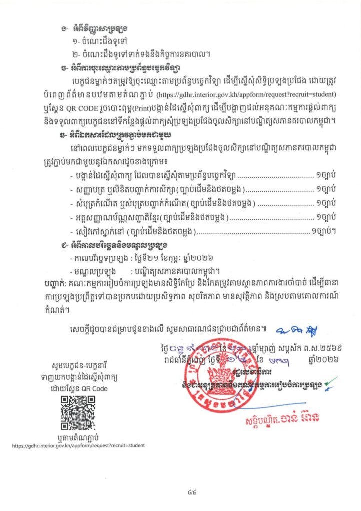ក្រសួងមហាផ្ទៃ ប្រកាសប្រឡងប្រជែងជ្រើសរើសនិស្សិត និងសិស្សនគរបាលអាហារូបករណ៍ប្រចាំឆ្នាំ នៅបណ្ឌិត្យសភានគរបាលកម្ពុជា