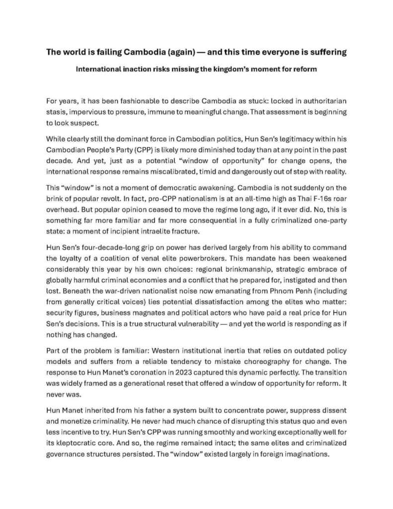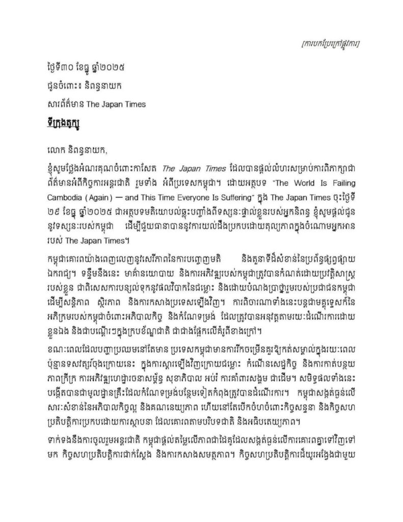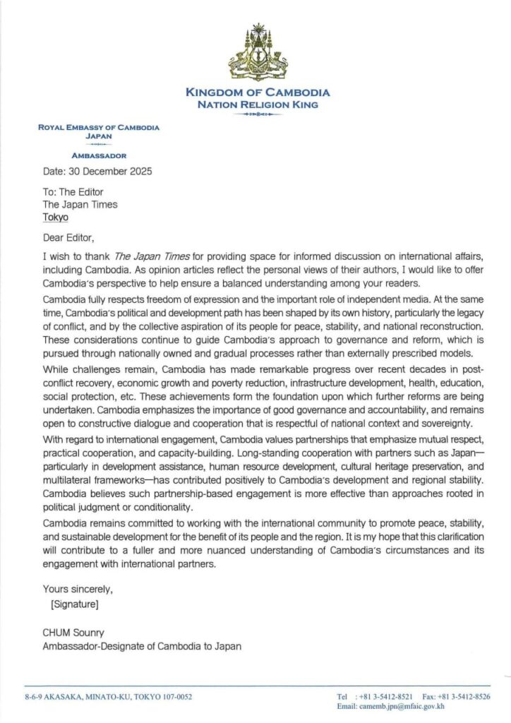 ឆ្លើយតបទៅនឹងអត្ថបទដែលបានចុះផ្សាយដោយសារព័ត៌មាន The Japan Times មានចំណងជើងថា “ពិភពលោកកំពុងបរាជ័យ នៅកម្ពុជា (ម្តងទៀត) និងលើកនេះគ្រប់គ្នាកំពុងឈឺចាប់ (The World is Failing Cambodia (Again) and This Time Everyone is Suffering)” របស់ឯកអគ្គរដ្ឋទូតកម្ពុជា បានធ្វើឡើងនៅថ្ងៃទី២៩ ខែធ្នូ ឆ្នាំ២០២៥ ហើយស្ថានទូតកម្ពុជាបានផ្ញើលិខិតបំភ្លឺទៅកាន់ អ្នកនិពន្ធនាយក របស់សារព័ត៌មាន The Japan Times កាលពីថ្ងៃទី៣០ ខែធ្នូ ឆ្នាំ២០២៥ ពាក់ព័ន្ធនឹងទស្សនៈរបស់កម្ពុជា ក្នុងការធានាឱ្យបាននូវតុល្យភាព និង ការយល់ដឹងបន្ថែមទៀត ក្នុងចំណោមសាធារណជន ៕