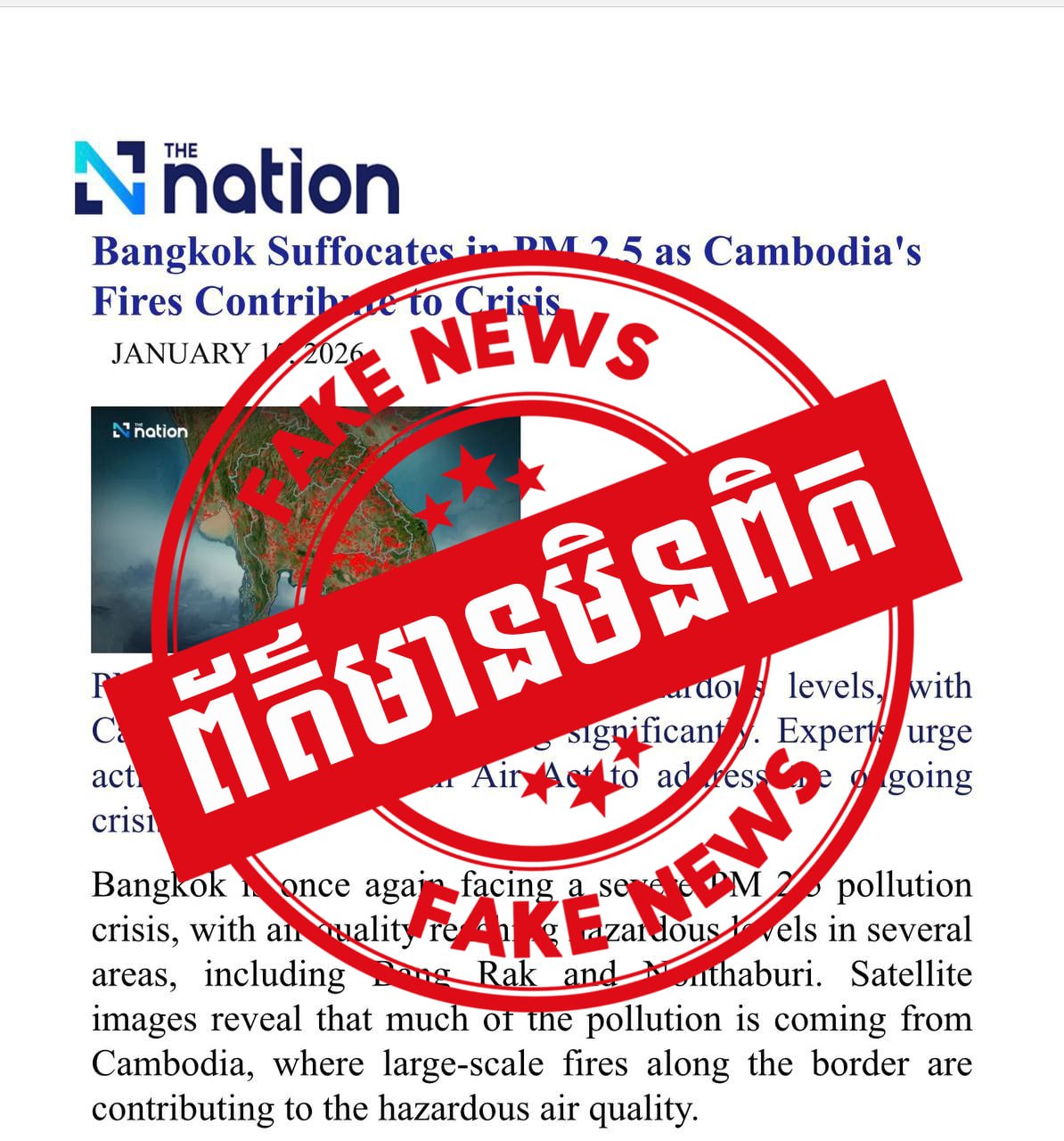 ភ្នំពេញ ៖ ឆ្លើយតបទៅនឹងអត្ថបទ ដែលមានចំណងជើងថា «វិបត្តិ នៃការកើនឡើង កម្រិតភាគល្អិតនិចល PM2.5 នៅទីក្រុងបាងកក គឺជាការរួមចំណែកពីភ្លើងឆេះដែលកើតឡើង នៅក្នុងប្រទេសកម្ពុជា (Bangkok Suffocates in PM 2.5 as Cambodia’s Fires Contribute to Crisis) ដែលបានចុះផ្សាយនៅថ្ងៃទី១៥ ខែមករា ឆ្នាំ២០២៦ បានលើកឡើងថា «ការបំពុលខ្យល់នៅទីក្រុងបាងកក គឺមានការរួមចំណែកសំខាន់ពីភ្លើងឆេះ ដែលកើតមាននៅក្នុងប្រទេសកម្ពុជា»។