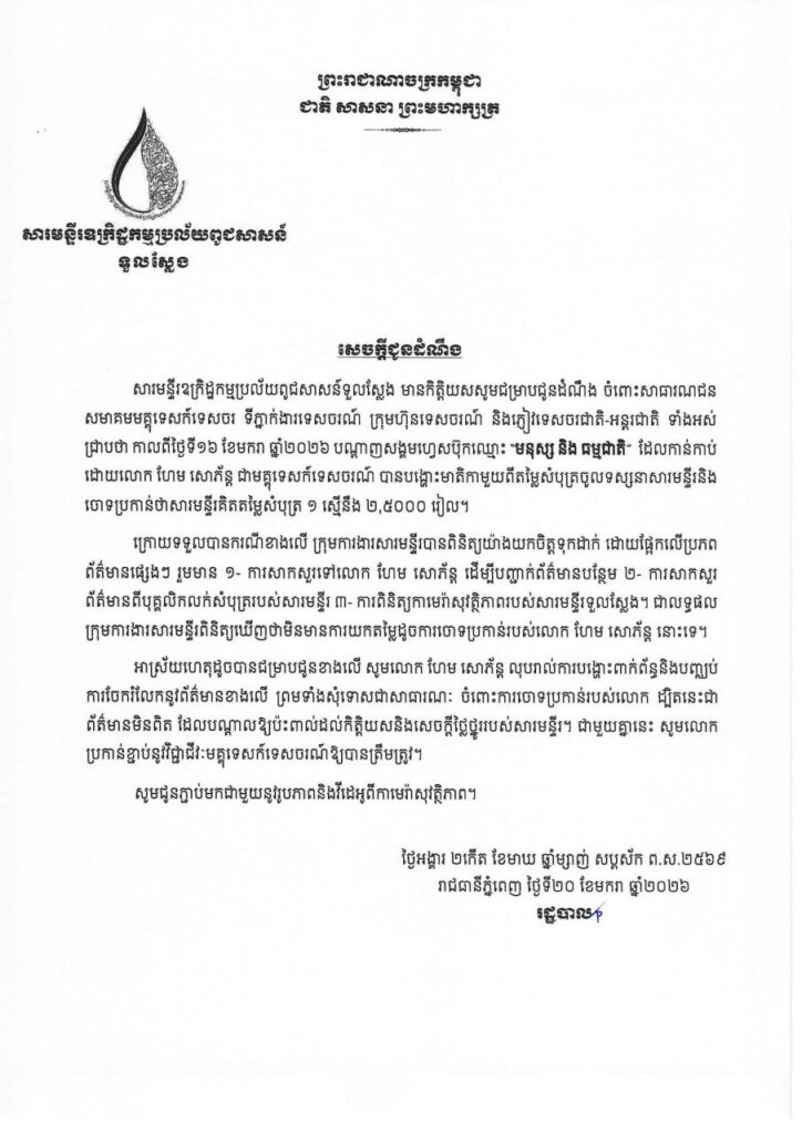 ការចេញមកបដិសេធនេះ បន្ទាប់ពីមានករណីបង្ហោះព័ត៌មានមិនពិតលើបណ្ដាញសង្គមហ្វេសប៊ុកដោយលោក ហែម សោភ័ន្ត ។ កាលពីថ្ងៃទី១៦ ខែមករា ឆ្នាំ២០២៦បណ្តាញសង្គមហ្វេសប៊ុកឈ្មោះ “មនុស្ស និងធម្មជាតិ” ដែលមានម្ចាស់គណនីឈ្មោះ ហែម សោភ័ន្ត ជាមគ្គុទេសក៍ទេសចរណ៍ បានបង្ហោះមាតិកាមួយពីតម្លៃសំបុត្រចូលទស្សនាសារមន្ទីរទួលស្លែងនិងចោទប្រកាន់ថា សារមន្ទីរគិតតម្លៃសំបុត្រ១ ស្មើនឹង២,៥០០០ រៀល។