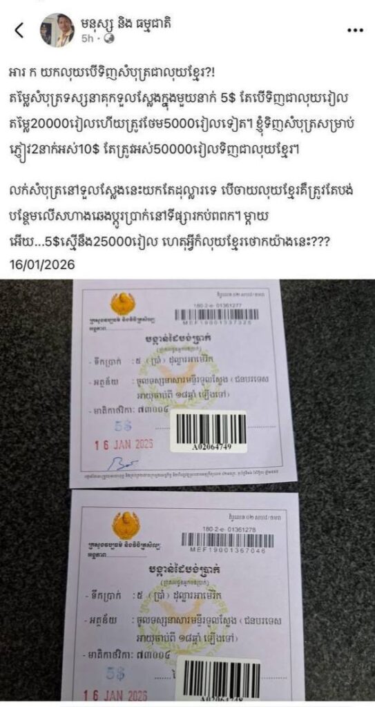 ខ្លឹមសាររបស់ម្ចាស់អាខោននេះ លើកឡើងថា “សំបុត្រ១មានតម្លៃ៥ដុល្លារ ប៉ុន្តែបើគិតជាលុយ២ម៉ឺនហើយ ត្រូវថែម៥ពាន់រៀលទៀត។ ហេតុនេះ ២សំបុត្រ១០ដុល្លារ តែគិតជាលុយខ្មែរគឺអស់៥ម៉ឺនរៀល”។