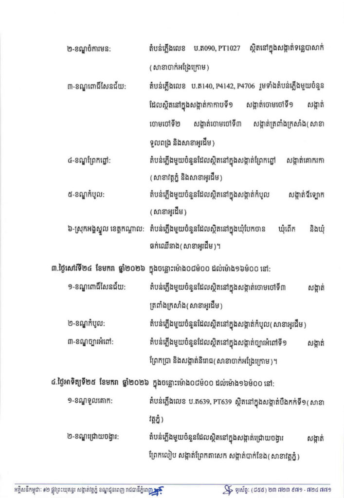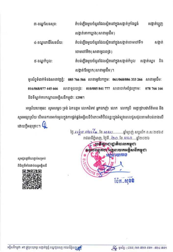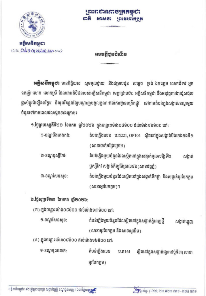 EDC ជូនដំណឹងពីការរអាក់រអួលចរន្ត តាមតំបន់សង្កាត់ ខណ្ឌ មួយចំនួនចាប់ពីថ្ងៃនេះ ដល់ថ្ងៃទី២៥ ខែមករា ឆ្នាំ២០២៦ ដើម្បីរុះរើគន្លងខ្សែបណ្តាញ ផ្លាស់ប្តូរ តម្លើងបរិក្ខារ ងាយស្រួលដល់ការដ្ឋានពង្រីកផ្លូវ