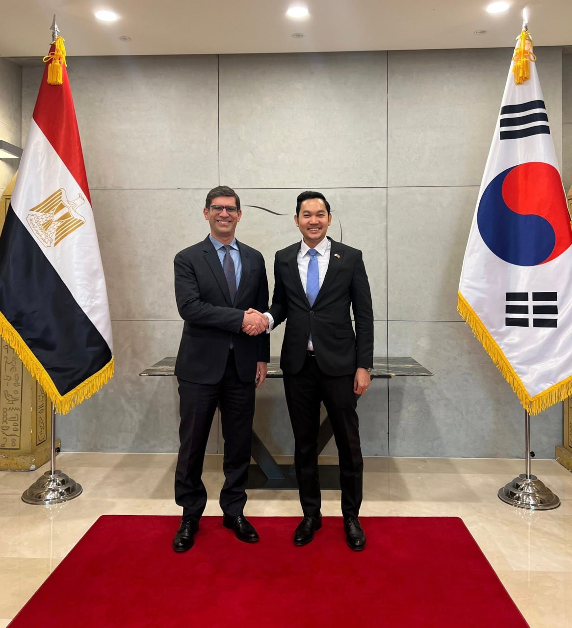 ក្នុងជំនួបសម្តែងការគួរសមរវាងលោក ឃួន ផុនរតនៈ និងលោក Hazem Ismail Ibrahim Zaki នៅថ្ងៃទី ២១ ខែមករា ឆ្នាំ២០២៦ ភាគីទាំងពីរបានពិភាក្សាផ្លាស់ប្តូរយោបល់ប្រកបដោយអត្ថន័យក្នុងការពង្រឹងទំនាក់ទំនង និងកិច្ចសហប្រតិបត្តិការរវាងស្ថានតំណាងនៃប្រទេសទាំងពីរ នៅសាធារណរដ្ឋកូរ៉េ ដើម្បីលើកកម្ពស់ប្រសិទ្ធភាពការងារ និងការគាំទ្រគ្នាទៅវិញទៅមកក្នុងបេសកកម្មការទូត នៅក្នុងវិស័យដែលមានផលប្រយោជន៍ទៅវិញទៅមក។