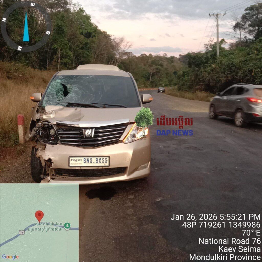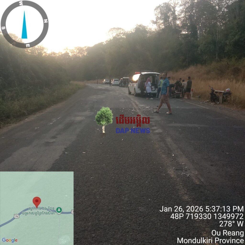 ខេត្តមណ្ឌលគិរី ៖ មានករណីគ្រោះថ្នាក់ចរាចរណ៍មួយ បានកើតឡើងនៅវេលាម៉ោង ១៦ និង ៣៥ នាទី ថ្ងៃទី២៦ ខែមករា ឆ្នាំ២០២៦ នៅចំណុចគីឡូម៉ែត្រលេខ ៦៤ ចន្លោះគីឡូម៉ែត្រលេខ ៨០/៨១ លើផ្លូវជាតិលេខ ៧៦ ស្ថិតក្នុងភូមិអូរអាម ឃុំស្រែខ្ទុម ស្រុកកែវសីមា ខេត្តមណ្ឌលគិរី ។