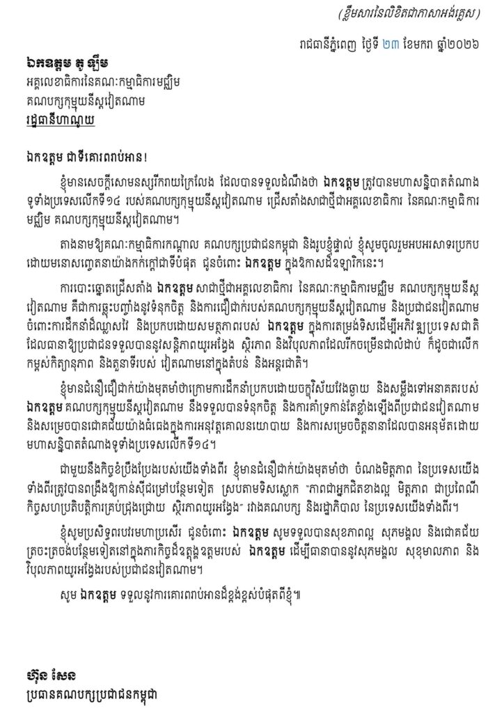 ក្នុងសារលិខិតអបអរសាទរ ប្រធានគណបក្សប្រជាជនកម្ពុជា សម្ដេចតេជោ ហ៊ុន សែន ក៏បានបង្ហាញជំនឿជឿជាក់យ៉ាង មុតមាំថា ក្រោមការដឹកនាំប្រកបដោយចក្ខុវិស័យវែងឆ្ងាយ និងសម្លឹងទៅអនាគតរបស់ឯកឧត្តម តូ ឡឹម បក្សកុម្មុយនីស្ត វៀតណាម នឹងទទួលបានទំនុកចិត្តនិងការគាំទ្រកាន់តែខ្លាំងឡើងពីប្រជាជនវៀតណាមនិងសម្រេចបានជោគជ័យយ៉ាងធំធេង ក្នុងការអនុវត្តគោលនយោបាយ និងការសម្រេចចិត្តនានាដែលបានអនុម័តដោយមហាសន្និបាតតំណាងទូទាំងប្រទេសលើកទី១៤។